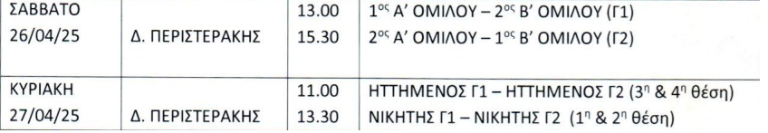 Το Σάββατο (26/04) θα αγωνιστεί ο 1ος του Α' ΟΜΙΛΟΥ με τον 2ο του Β' ΟΜΙΛΟΥ και ο 2ος του Α' ΟΜΙΛΟΥ με τον 1ο του Β' ΟΜΙΛΟΥ.