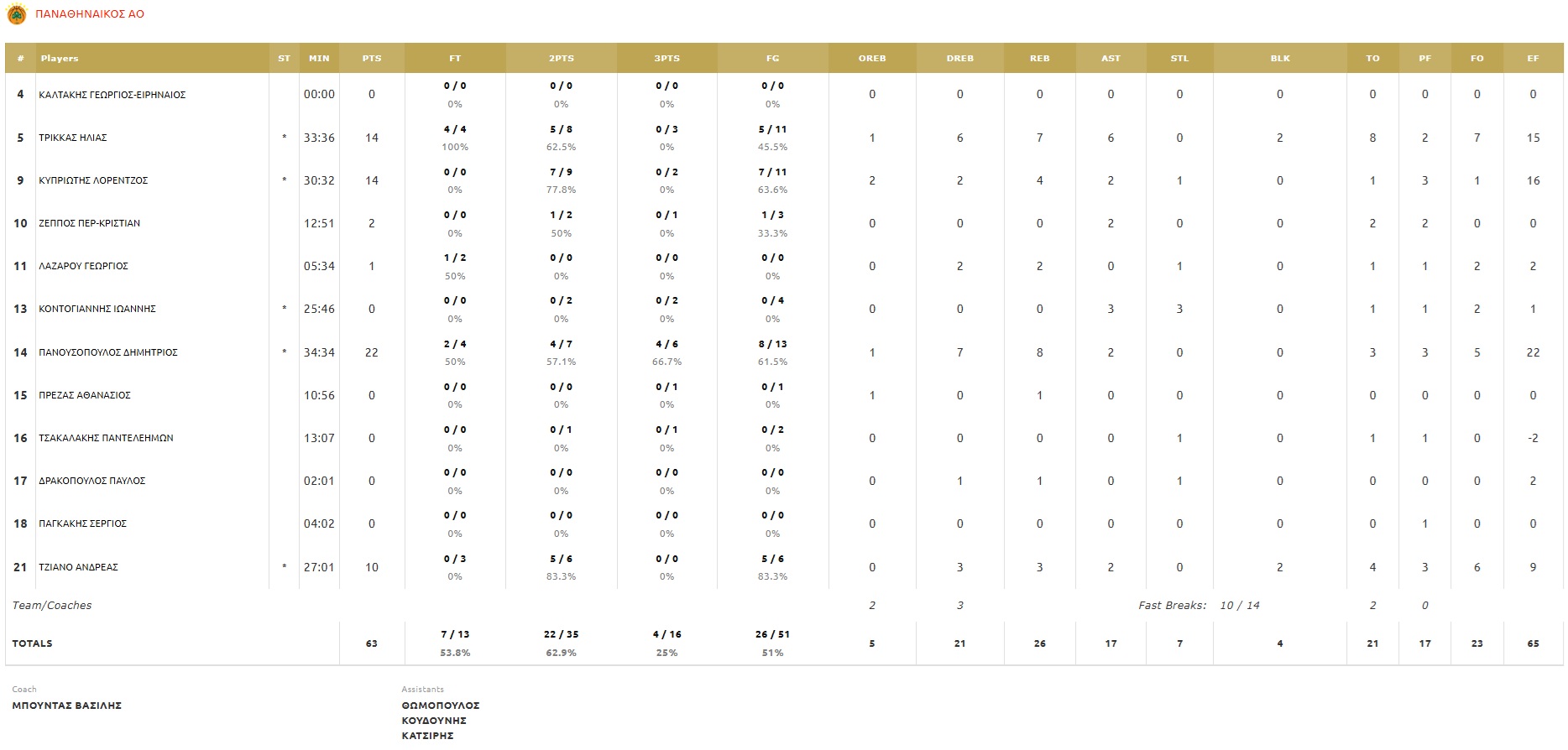 Παναθηναϊκός (Μπούντας-Θωμόπουλος-Κουδούνης-Κατσίρης): Τρίκκας 14(6ασ.), Κυπριώτης 14, Ζέππος 2, Λαζάρου 1, Κοντογιάννης, Πανουσόπουλος 22(4), Πρεζάς, Τσακαλάκης, Δρακόπουλος, Παγκάκης, Τζιάνο 10.