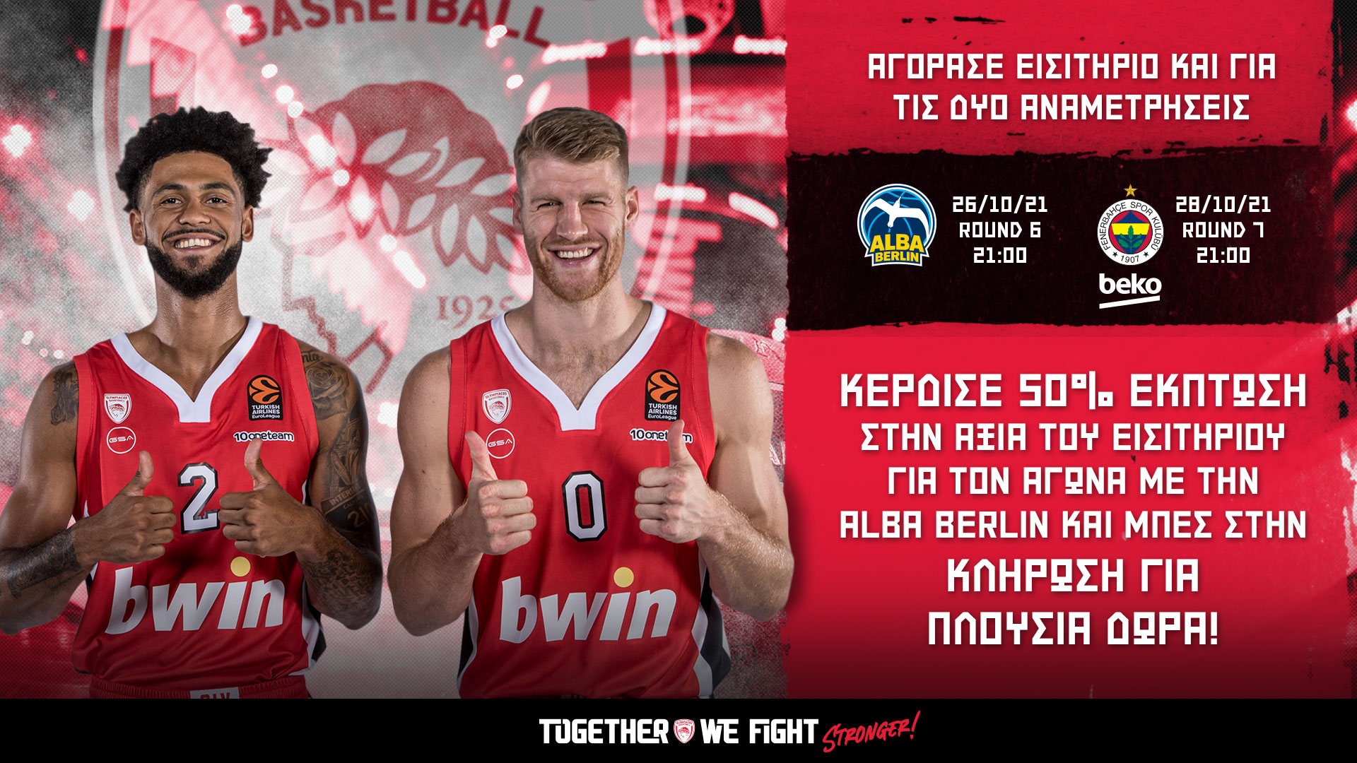 Εξασφάλισε τη θέση σου στους εντός έδρας αγώνες της Ευρωλίγκας κόντρα σε Άλμπα Βερολίνου (26/10/21, 21.00) και Φενέρμπαχτσε (28/10/21, 21.00) και βγες πολλαπλά κερδισμένος!
