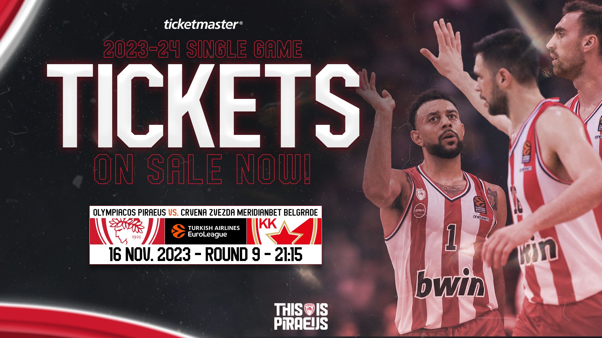 H Κ.Α.Ε ΟΛΥΜΠΙΑΚΟΣ ανακοινώνει ότι, για τον αγώνα με την CRVENAZVEZDAMERIDIANBETBELGRADE της ΠΕΜΠΤΗΣ 16/11/2023 με ώρα έναρξης 21:15, η διάθεση των εισιτηρίων γίνεται: