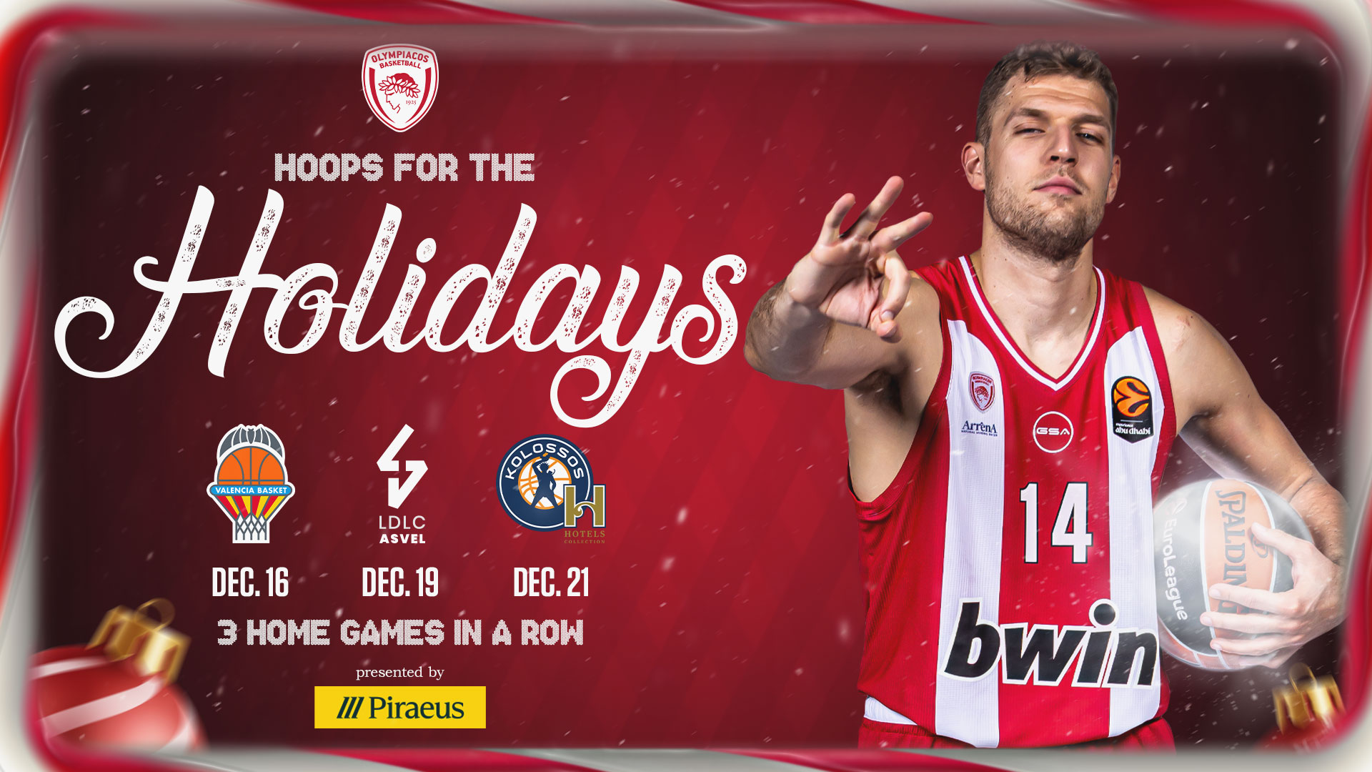 Ο Ολυμπιακός δίνει τρία σερί εντός έδρας παιχνίδια (16/12 με Βαλένθια, 19/12 με Βιλερμπάν, 21/12 με Κολοσσό Ρόδου) και σας περιμένουμε από νωρίς στις θέσεις σας με δράσεις, εκπλήξεις και μοναδικά δώρα για όλους!
