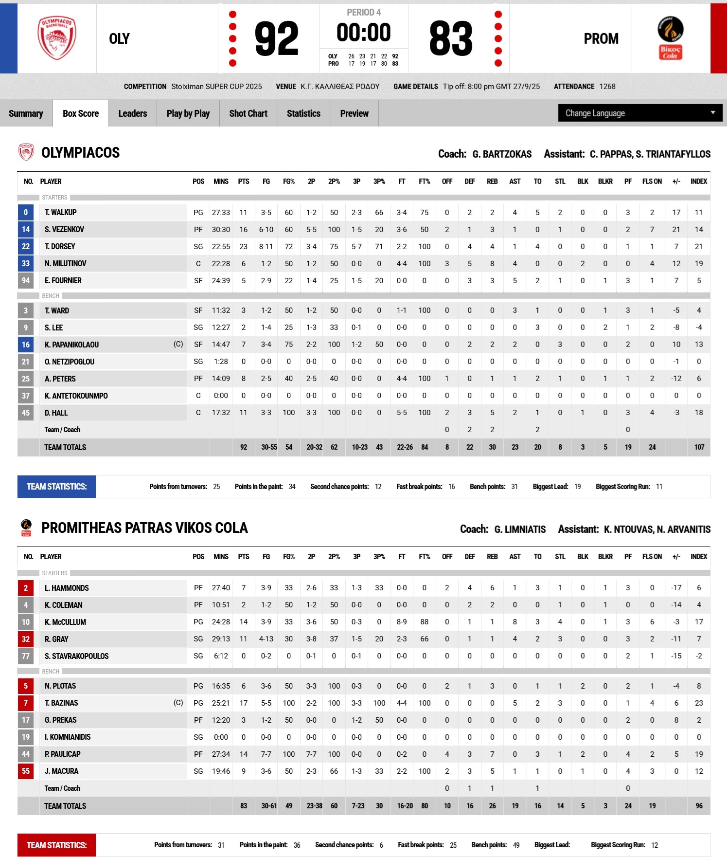 Ο Ολυμπιακός επικράτησε 92-83 του Προμηθέα Πατρών στον τελικό του Super Cup και κατέκτησε την πρώτη κούπα της χρονιάς!