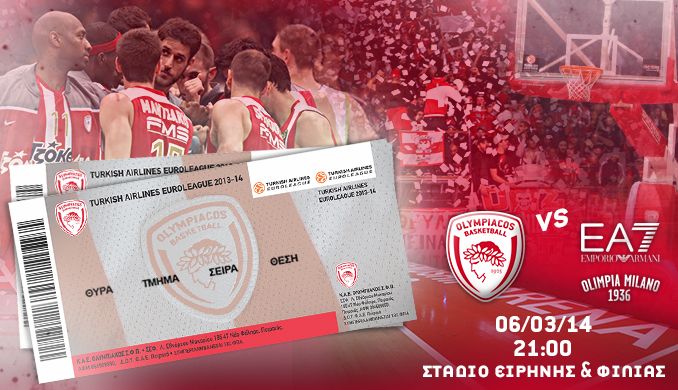 Η Διεύθυνση Εισιτηρίων της Κ.Α.Ε. ΟΛΥΜΠΙΑΚΟΣ ανακοινώνει ότι η διάθεση των εισιτηρίων για τον αγώνα TOP-16 της Euroleague, OLYMPIACOS – EA 7 EMPORIO ARMANI MILAN, ο οποίος θα διεξαχθεί την Πέμπτη 6 Μ…