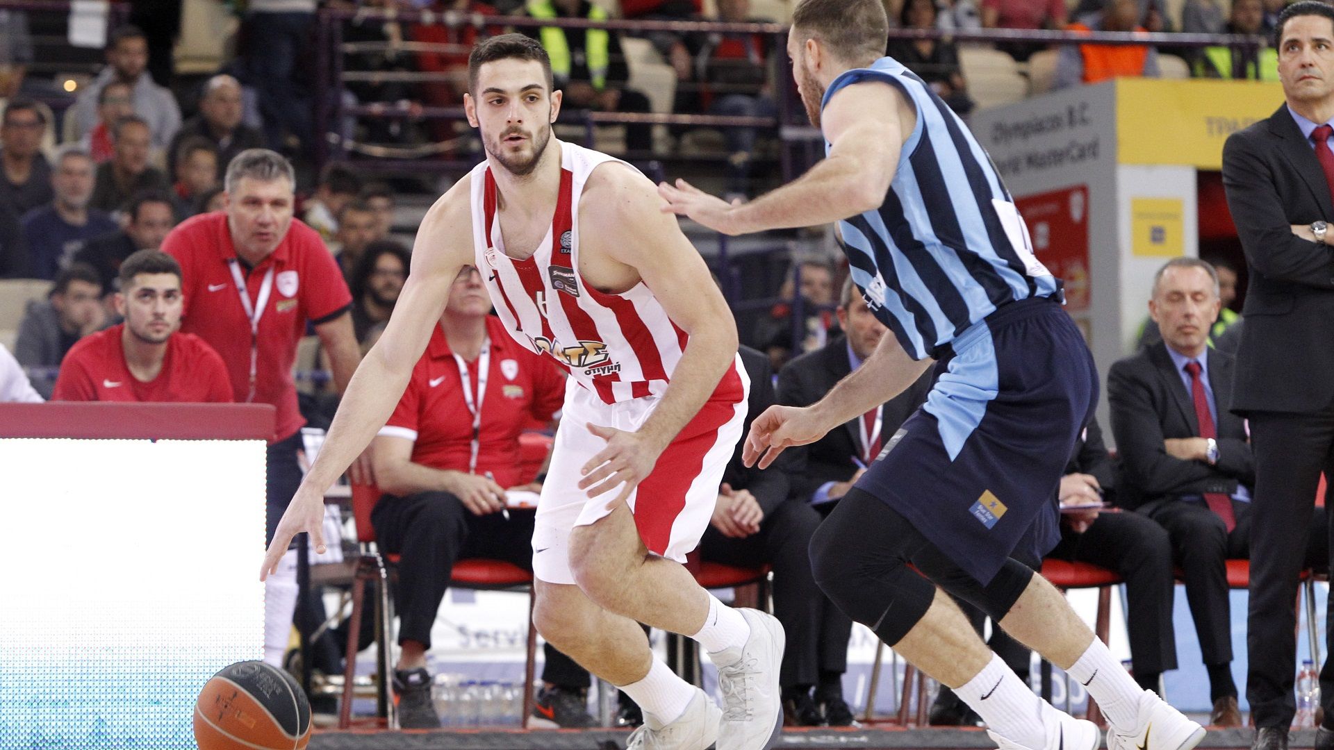 Με καλή άμυνα και επιθετική πολυφωνία οι "ερυθρόλευκοι" (παρά τα 7 λάθη που υπέπεσαν στο πρώτο δεκάλεπτο), επέβαλαν τον ρυθμό τους και "έχτισαν" μια διαφορά 12π. (16-4, στο 5' και 20-8 στο 9').  Στην συνέχεια βρήκαν στόχο και από την περιφέρεια, κάτι που τους επέτρεψε να ανεβάσουν κι άλλο τον δείκτη της διαφοράς (+16, 37-21, στο 17') και να πάνε στα αποδυτήρια με την ολοκλήρωση του πρώτου εικοσαλέπτου προηγούμενοι με 15π. (42-27).