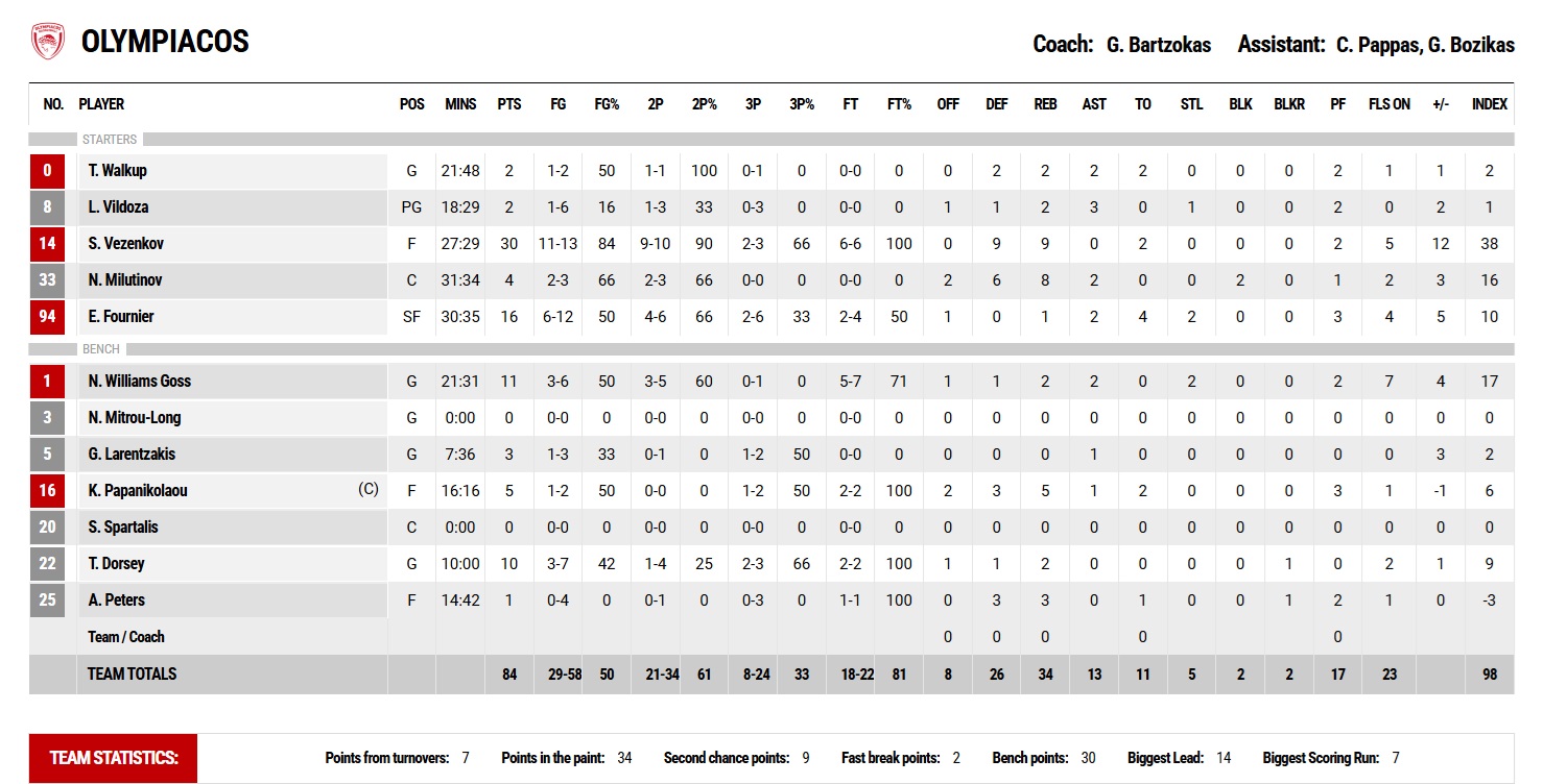 The third quarter began with greater intensity in defense and seven unanswered points by Sasha Vezenkov (35-47, 22') with the margin widening to 12 points. Panionios reacted striking from the perimeter and taking advantage of some bad choices, our team made when attacking, dropped the difference to single digits (43-49, 25'). Sasha Vezenkov and Nikola Milutinov were providing scoring solutions (46-54, 26'), however, missed shots and turnovers facilitated a 7-2 partial for Panionios, for the 53-56 that marked the end of the third quarter. In the last quarter, Nikola Milutinov was the protagonist of the two initial plays of the game, making the score 53-58, for Evan Fournier to follow with five points of his own and hence the score becoming 55-64 (33'), with Olympiacos controlling the game after getting into rhythm in offense (58-71, 35'). The French guard upped the difference to 14p. (58-71) with five minutes remaining for the end of the game. Panionios tried to stay in the game (66-77, 37'), but our team remained focused to the end and Williams-Goss scored an important 2-pointer for the 74-83, 39') to secure a big win in a tough court (78-84), before the double Euroleague week that follows...