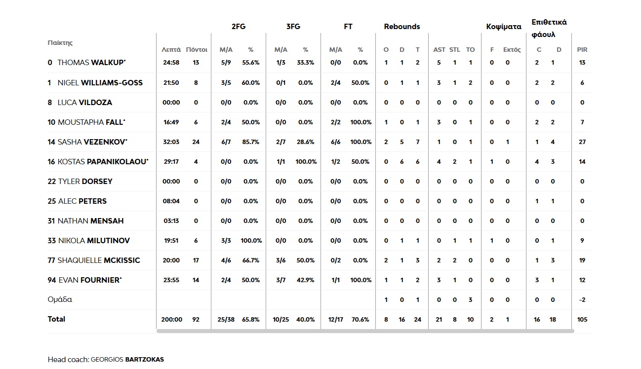 The 'red & whites' did not start the game well. Lacking clear thinking offense wise, as well as the required concentration in defense, they trailed the score early on (10-4, 4'). Thomas Walkup offered some score (18-10, 7'), while two back-to-back threes by Kostas Papanikolaou and Sasha Vezenkov made for a 2-point game (18-16), before the first quarter ending at 22-18. The second quarter began with a stolen ball that led to dunking in the fast-break (Shaquille McKissic, 22-20). The American player took center stage, offering lots of energy to our team's game (34-30, 14'). Ineffecient defense and lost rebounds though, gave the hosts the opportunity to once again up the difference to double digits (44-32, 17'). At that point, Nigel Williams-Goss and Evan Fournier took over, temporarily shrinking the margin (44-40, 28'), for Trinchieri's team to reply with an 8-0 of their own, again striking from the long range (11/17 3p.), with half-time ending at 52-40.
