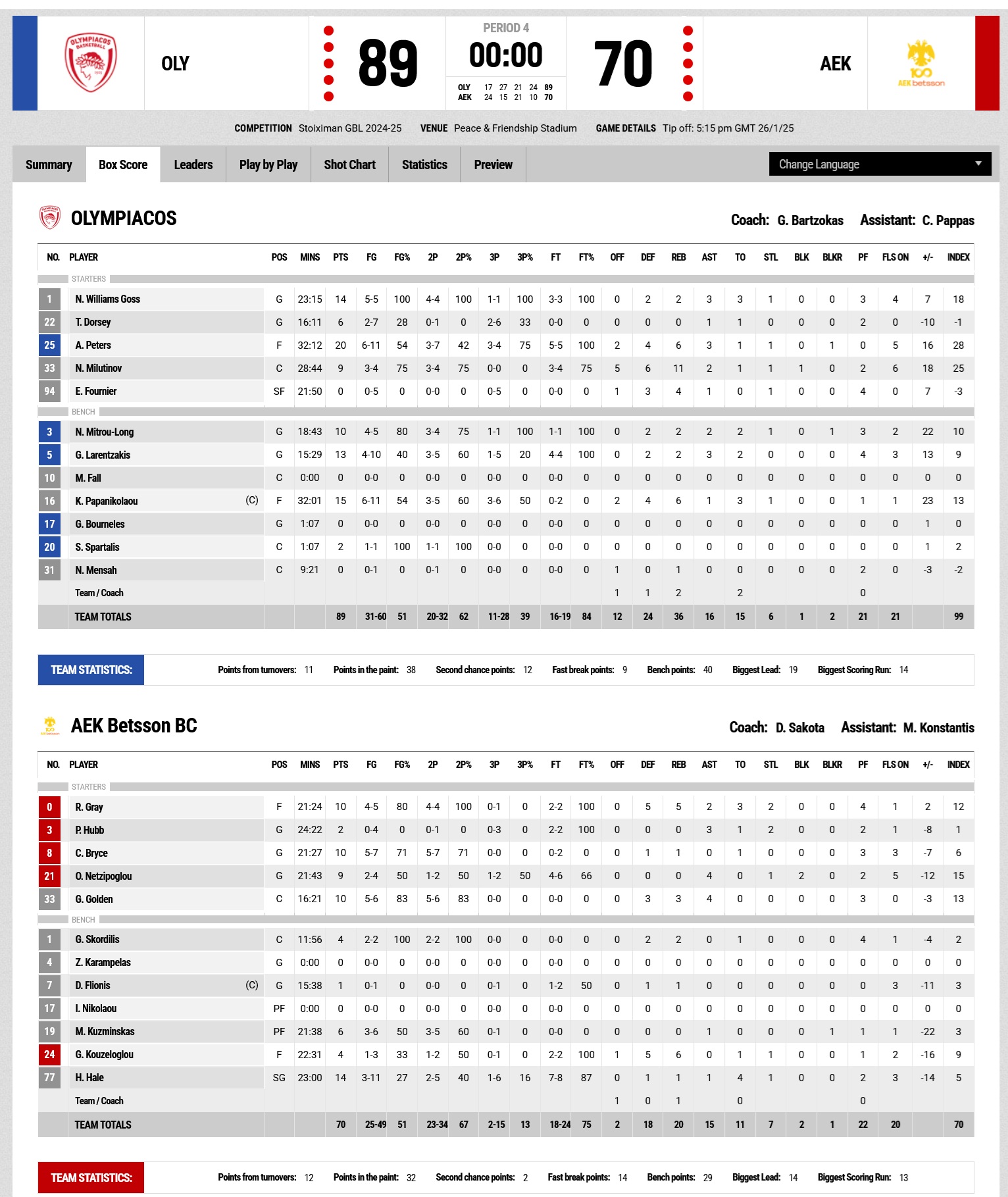 In the third quarter, our team continued controlling the game, putting pressure on the defensive end and exhibiting patience in offense. They also got a double-digit lead (54-44, 23'), with Alec Peters and Williams-Goss leading the charge. AEK remained competitive, closing in to three points (57-54), with Tyler Dorsey adn Williams-Goss scoring to make the difference 7p. for our team (63-56, 28') and the quarter ending at 65-60. The last quartr began with an 8-0 run for our team (73-60, 34'), that put the foundations for the win. Two threes, by Larentzakis and Mitrou-Long upped the margin to 17p. (79-62, 36'), with AEK not being able to continue fighting the game. A 3-pointer by captain Kostas Papanikoalou made the score 84-64 (37'), while with 1:07'' on the clock, Giorgos Bourneles and Stefanos Spartalis (i.e. juniors that participate the roster) entered the game, with the latter scoring following an assist by Larentzakis to mark the final 89-70.