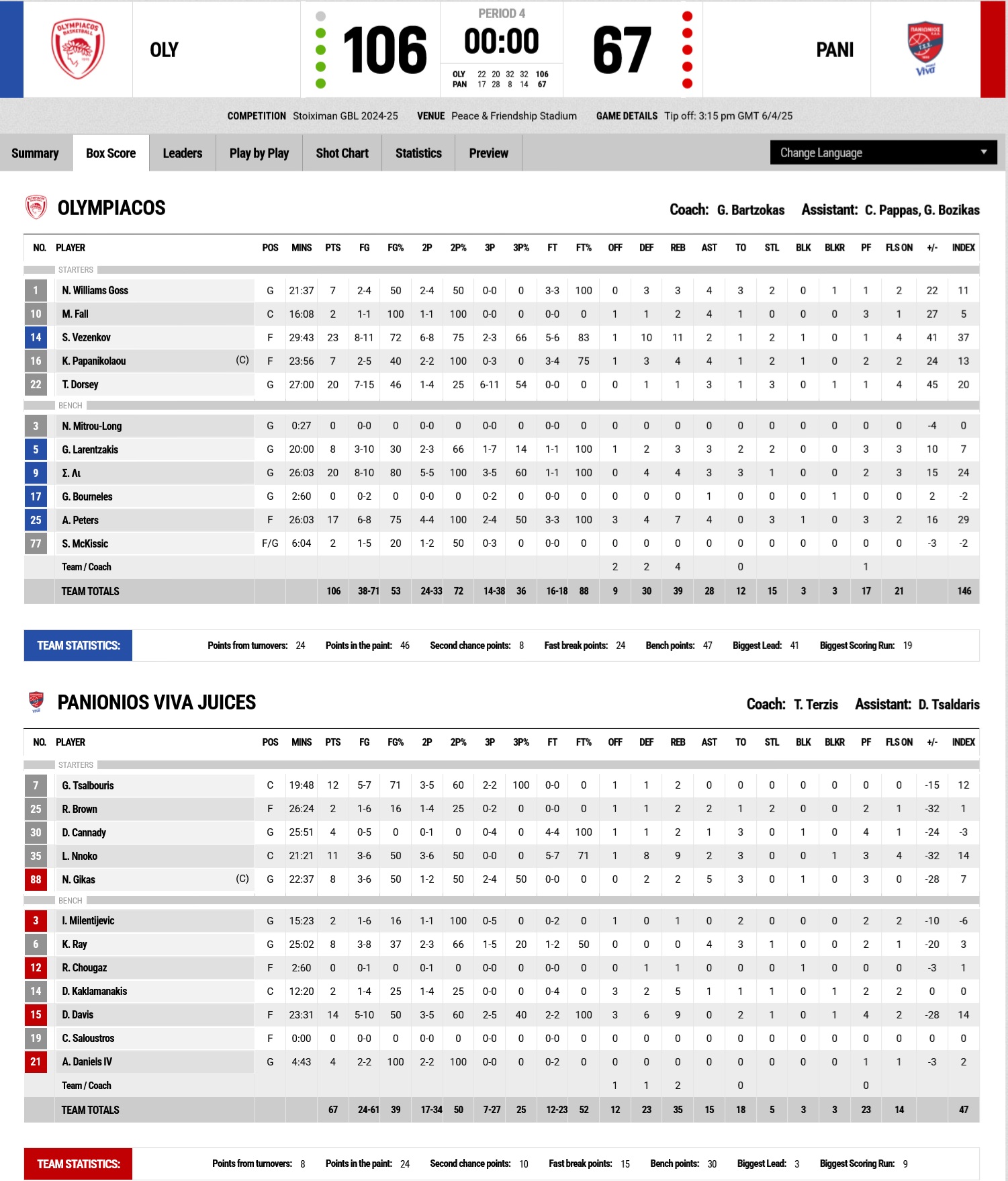 A three-pointer from Sasha Vezenkov and a nice collaboration between Dorsey and Papanikolaou saw Olympiacos take the lead again in the first minute of the third quarter (47-45, 22'). Panionios responded from beyond the arc twice, staying - temporarily - close in score, but Olympiacos answered with a 19-0 run, led by Tyler Dorsey and Sasha Vezenkov (69-51, 28'). Saben Lee, with an and-one play, and Alec Peters added more to make it +21 (74-53) at the end of a quarter where our team was dominant, with a 32-8 scoreline. Little changed in the final quarter. With the game practically decided, Olympiacos entertained the crowd with beautiful teamwork and energy on the court, such as Lee’s assist leading to Mustafa Fall’s dunk (79-55, 32'). The American guard and Yanoulis Larentzakis pushed the lead to +30 (86-55, 34') as Panionios couldn’t keep up. Lee, with two three-pointers, excited the crowd, and with three minutes remaining, George Bournelis also made his appearance. Alec Peters' three-pointer made it 100-63, and the game finished 106-67.