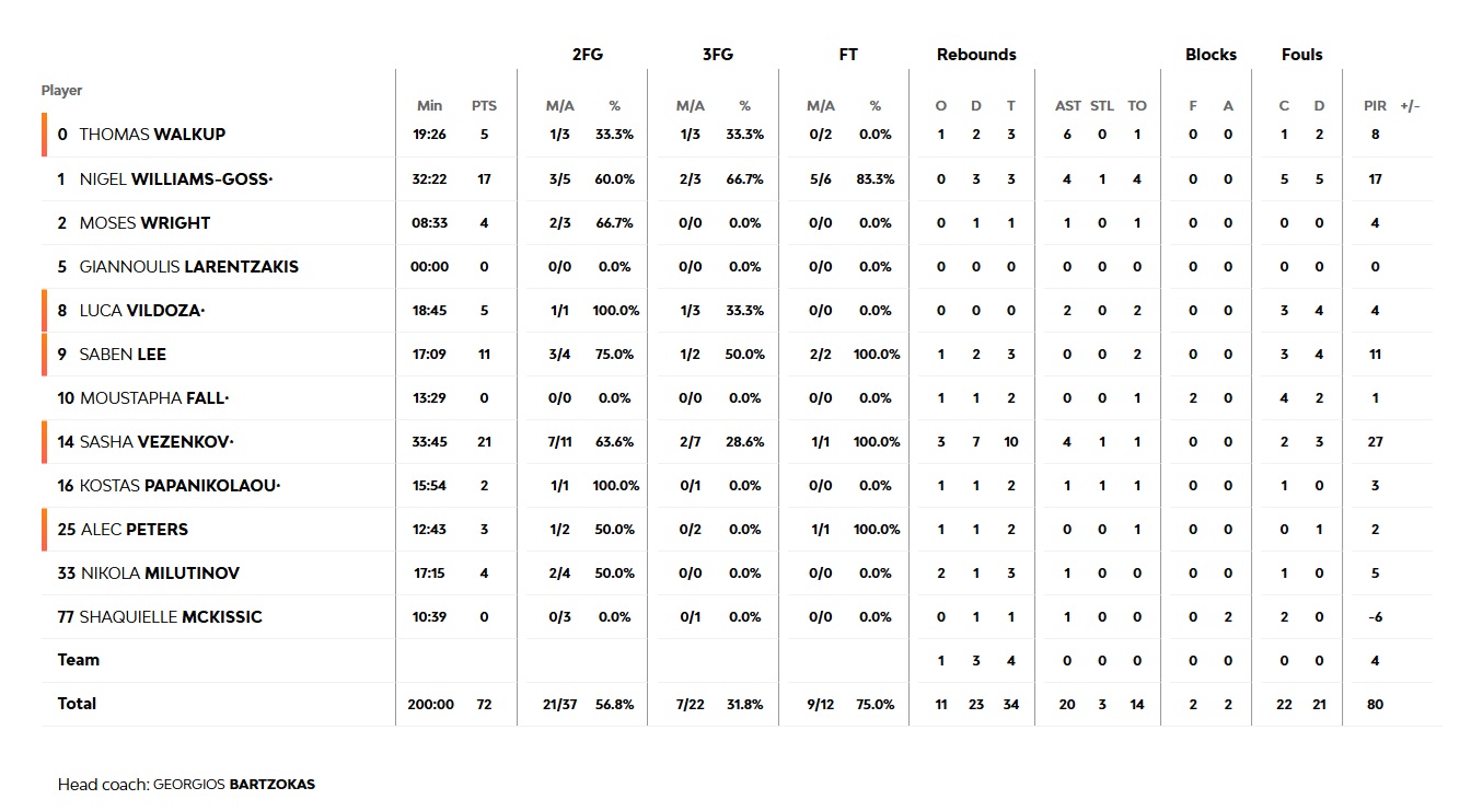 Poor offensive choices allowed Real to counterattack with an 8-2 run in the first four minutes of the second half, tying the game (46-46, 24'). At that point, Sasha Vezenkov stepped up, hitting his first three-pointer to slow down the Madrid team, with Saben Lee following soon after to put Olympiacos ahead once again (51-54, 25'). Sasha Vezenkov scored the last basket of the quarter at the buzzer, in a period where the team struggled offensively, closing the third quarter at 58-56 in favor of Real. Offensive mistakes continued, and Real took advantage of them, building a 10-point lead (72-62, 35'). A basket and foul by Vezenkov, a three-pointer by the Bulgarian forward, and two successful free throws by Lee brought Olympiacos back within two points (72-70, 38'), but the team couldn't retake the lead and ultimately lost the game 80-72. Now the 'red & whites' must win Thursday's (01/05) game.