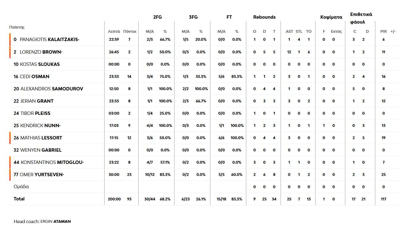 Our team continued to control the game, moving the ball patiently (81-69, 32'). Larentzakis hit from deep (89-74, 35'), as did Peters with a mid-range jumper (91-78, 37'). An unnecessary drop in focus in the final three minutes allowed a 6-15 run by Panathinaikos (97-93), but the game ended with a steal by Sasha Vezenkov on the final possession.