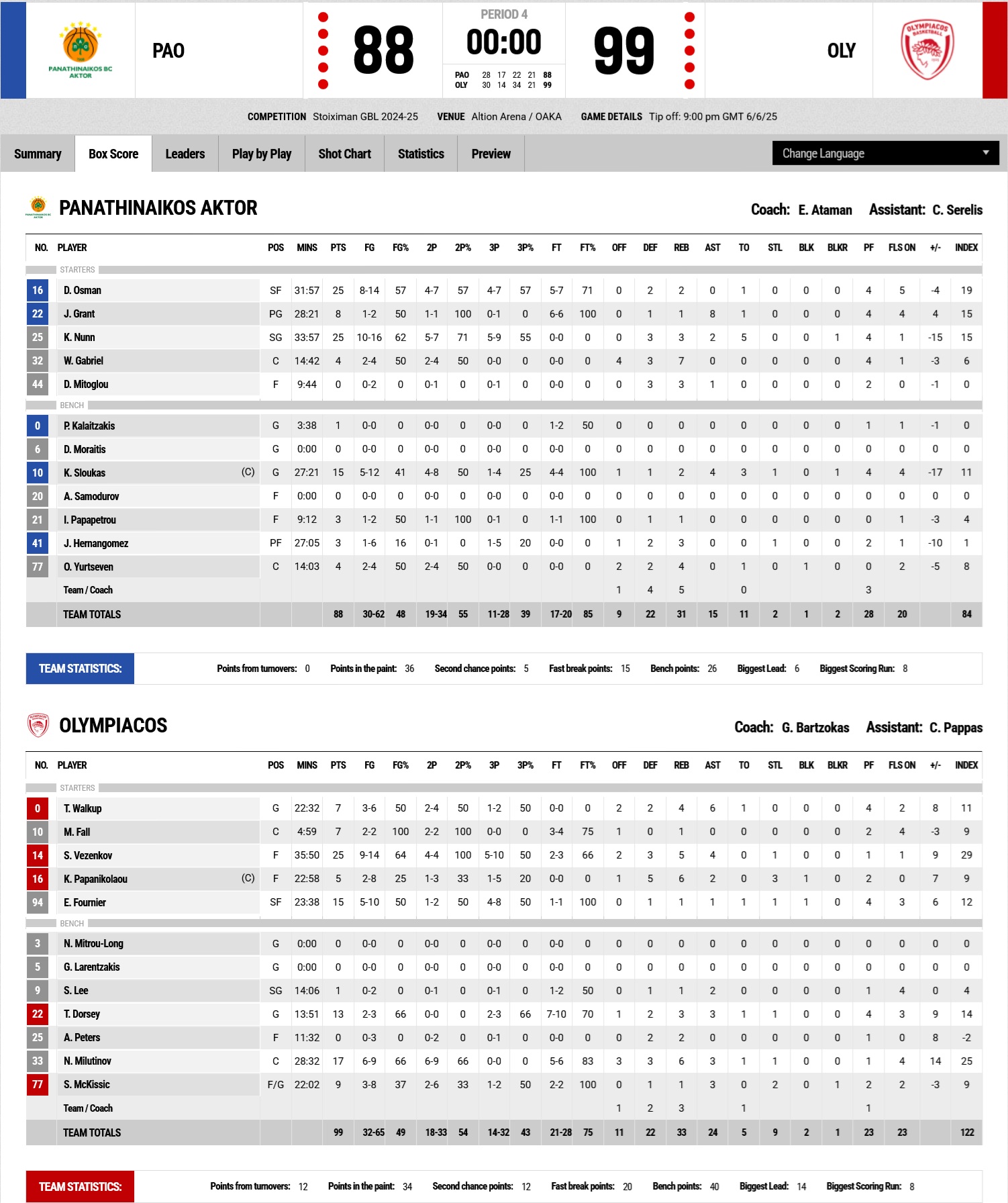 Just two plays into the final period, with the score at 70-80, Evan Fournier was hit with a very hard foul by Kendrick Nunn on a fast break, resulting in a lengthy stoppage. The referees reviewed the play via instant replay and addressed an altercation between Fournier and home fans near the court seats, ultimately issuing a technical foul and ejecting him. After play resumed, Olympiacos - still without a point guard - made poor offensive choices, but strong defense led to steals and transition points, including a dunk by Papanikolaou (73-84, 34'). Thomas Walkup, upon returning, finished a play near the basket, and Shaquielle McKissic hit a three-pointer to push the lead to its peak (+14, 75-89). Panathinaikos hit a few late threes to cut the deficit to single digits (81-91, 38'), but Tyler Dorsey and Nikola Milutinov remained calm from the free-throw line (86-97, 39'), and Olympiacos sealed the win (99-88), taking a 2-1 lead in the finals series.