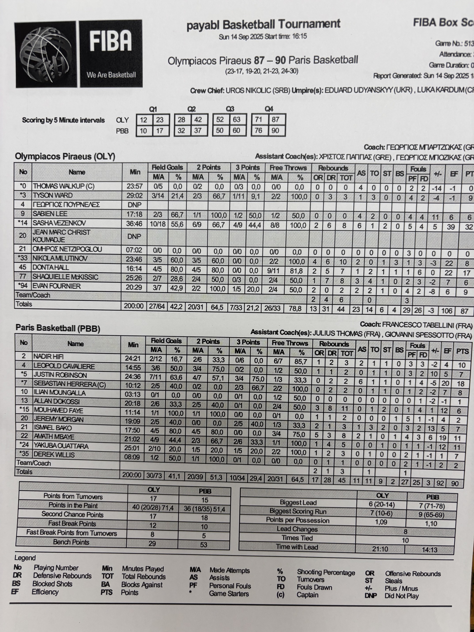 In the final quarter, after an early basket by Ward, Olympiacos committed a series of offensive errors, which Paris capitalized on with a 12-0 run (65-69, 32'). Sasha Vezenkov remained the go-to guy for the Piraeus team, scoring from both beyond the arc and near the basket (74–78, 36'), with Donta Hall taking over next, first cutting the lead to 3 (82–85, 38') and then tying the game at 87-87 with 25'' left.