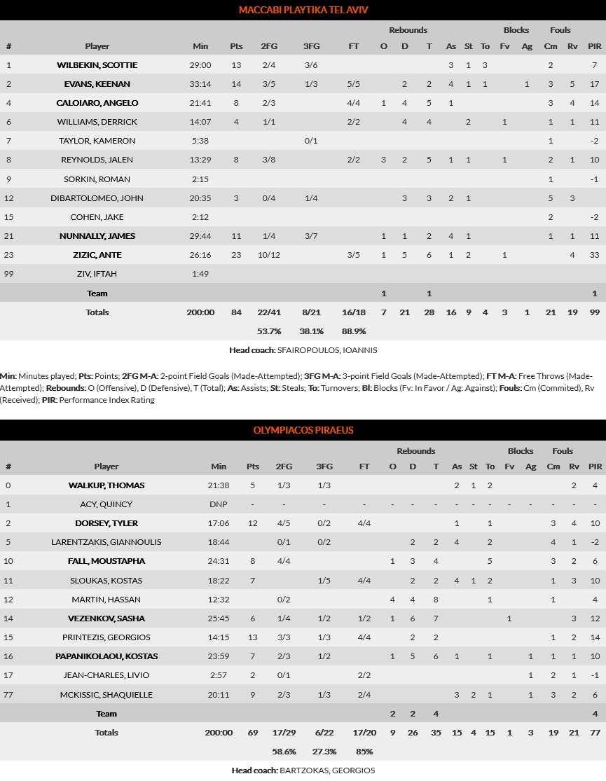 A three by Giorgos Printezis gave Olympiacos the lead for the first time (21-19 at 12’), while mainly relying on Shaquille McKissic, they got a +5 lead (23-28). However, Maccabi was quick with its reaction… Taking advantage of the bad percentages of the ‘reds’ (8/20 twos and 4/11 threes), they passed the ball to Zizic and regained the lead (40-38 at 20’).