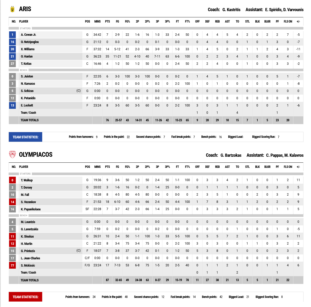 In the second half, the ‘reds’ inexplicably stepped on the brakes. Bad decisions in the offense and gaps in the defense allowed Aris (and more specifically, the unstoppable Hanlan) to drop the difference originally to 9p. (53-62 at 31’) and then to 7 (73-80 at 38’). The ‘reds’ though ran a partial 5-0 (73-85 at 39’), practically ‘ending’ the game.