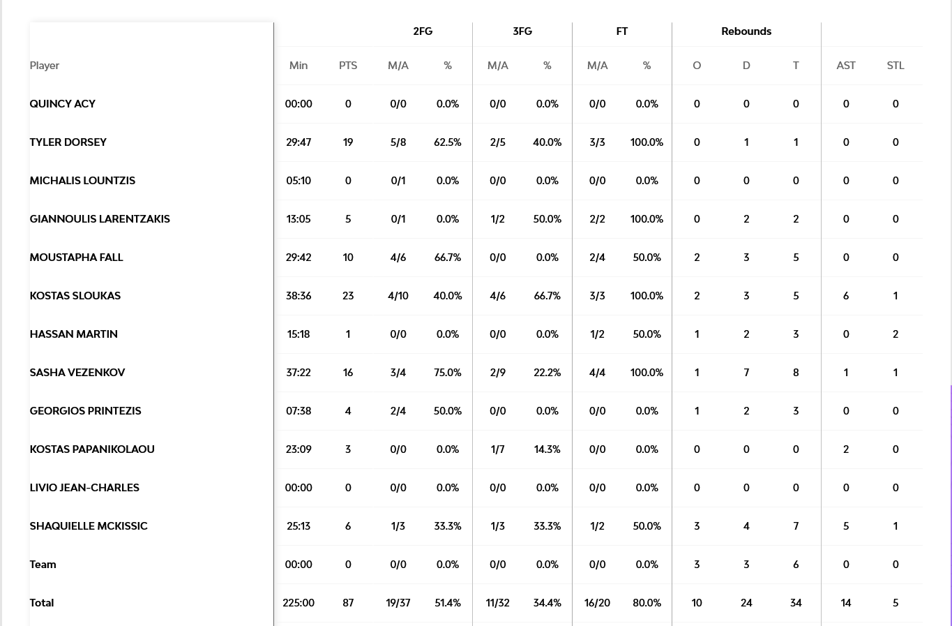 Efes got to lead by 3 for the first time in the second half (42-45), but the ‘reds’ had an immediate reaction. With two threes by Vezenkov and Papanikolaou and a dunk by Fall, they went ahead with a +5 (50-45), while under the leadership of Kostas Sloukas, consistently maintained the lead (61-56) up to 29’.