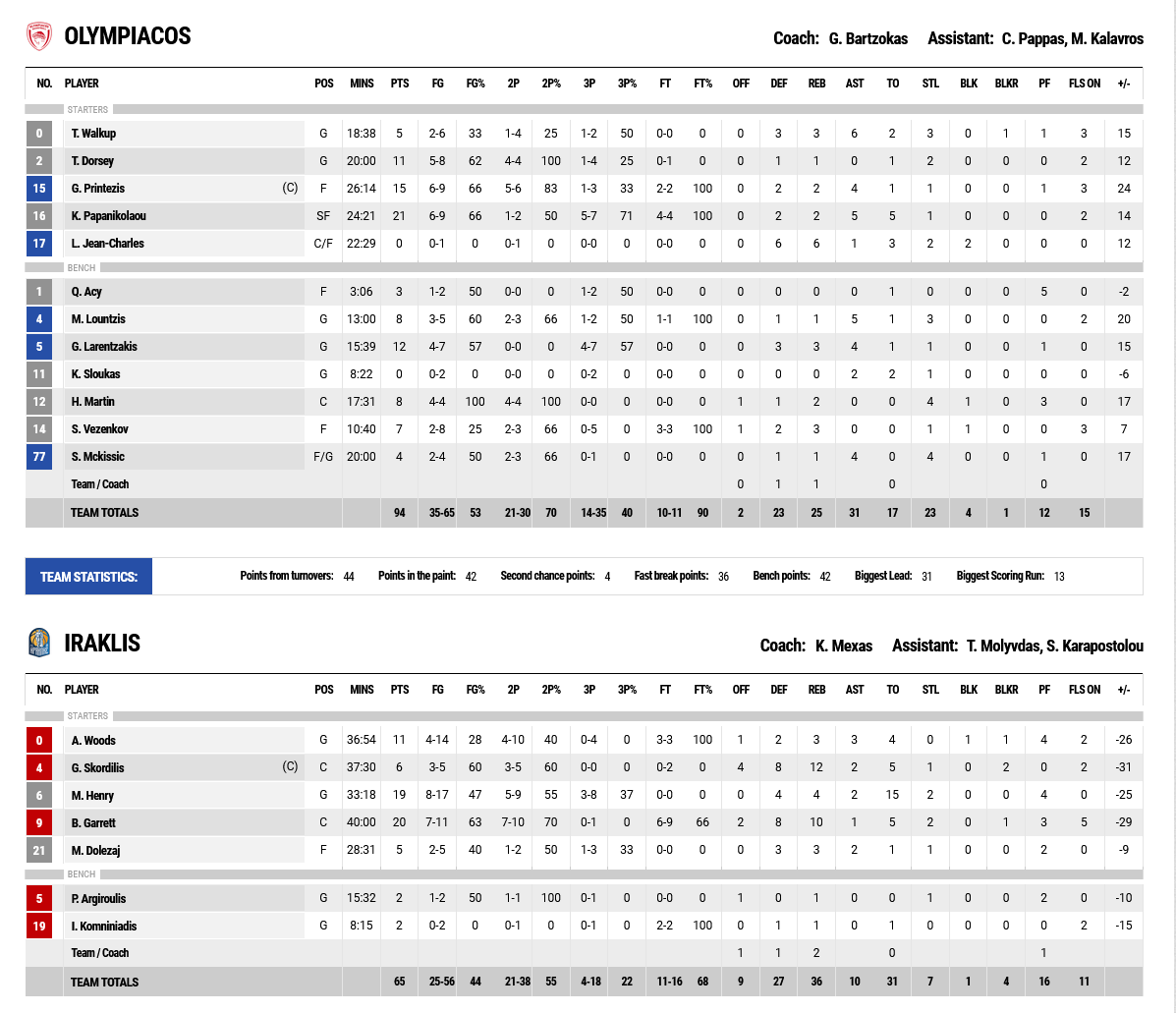 Olympiacos beat Iraklis at the SEF 94-65 for the 17th day of the Stoiximan Basket League.