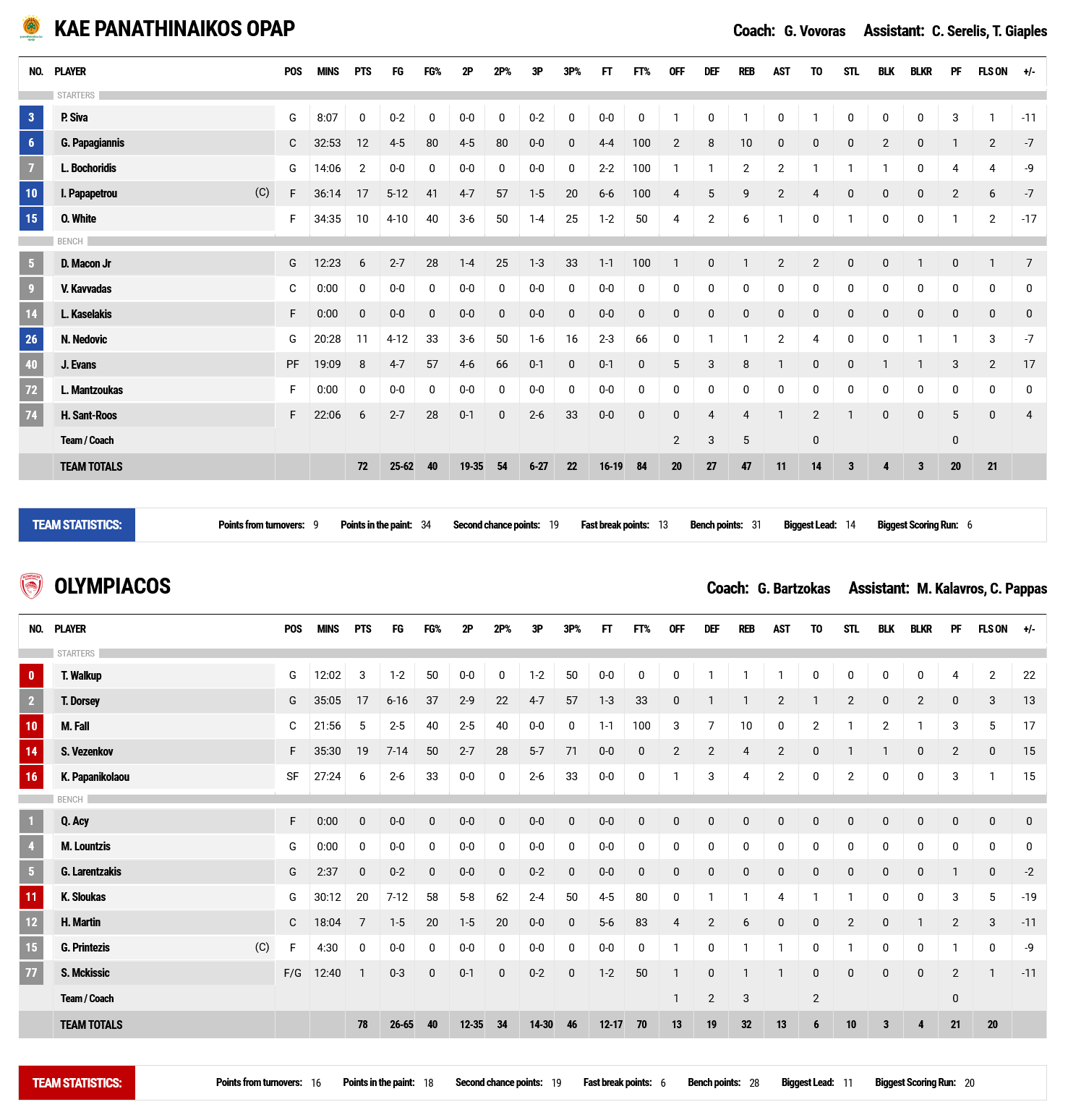 Contrary to the above, Bartzokas’ players played a perfect game in the third quarter and turned the situation in their favor once and for all. With a seminar worthy defense, good ball movement and excellent choices, they succeeded to take a +7 lead after running a partila 23-2 (48-55 at 26’). The ‘reds’ got to lead even by 11p. (63-74 at 35’), however, hasty choices and missed shots allowed the ‘greens’ to close in at 4p. (72-76), 42.9’’ before the end. The solution was provided by our team’s good defense, while the final 72-78 was written by Kostas Sloukas who made both his free throws at the time.