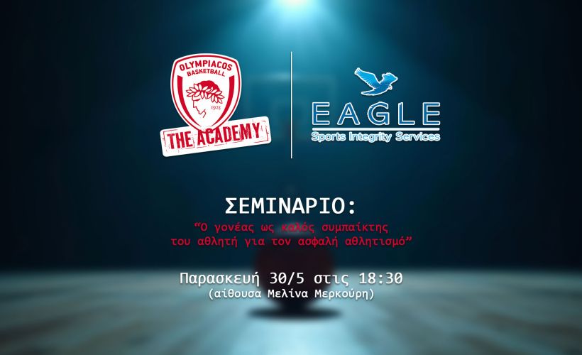 Η Ακαδημία του Ολυμπιακού σε συνεργασία με την EAGLE (Sports Integrity Services) πραγματοποιεί την Παρασκευή 30 Μαΐου σεμινάριο για την αθλητική ακεραιότητα με τίτλο: «Ο γονέας ως καλός συμπαίκτης του αθλητή για τον ασφαλή αθλητισμό».