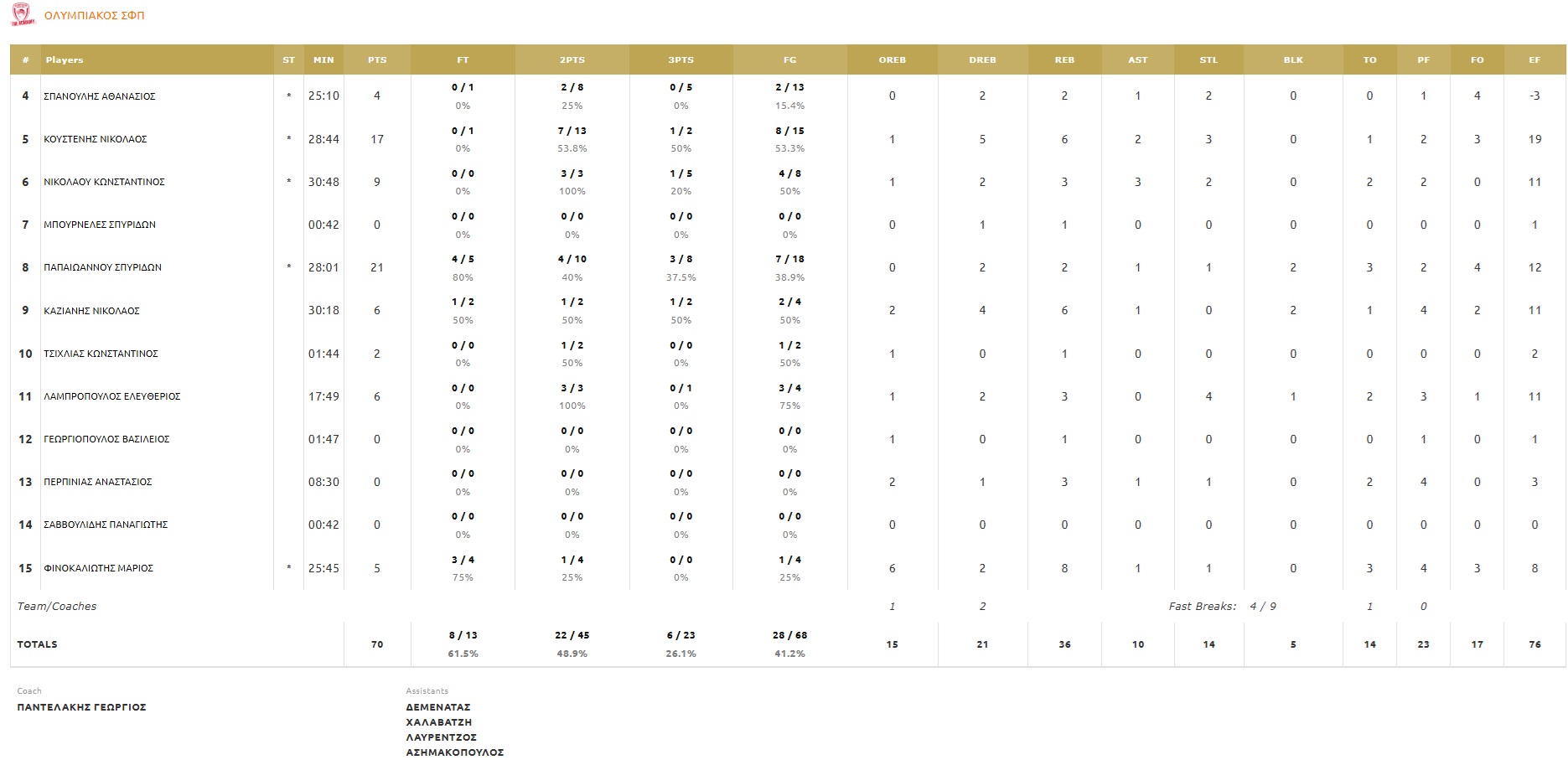 Ολυμπιακός (Παντελάκης-Δεμέναγας-Χαλβατζή-Λαυρέντζος-Ασημακόπουλος): Σπανούλης 4, Κουστένης 17(1), Νικολάου 9(1), Μπουρνελές, Παπαϊωάννου 21(3), Καζιάνης 6(1), Τσιχλιας 2, Λαμπρόπουλος 6, Γεωργιόπουλος, Περπινιάς, Σαββουλίδης, Φινοκαλιώτης 5.