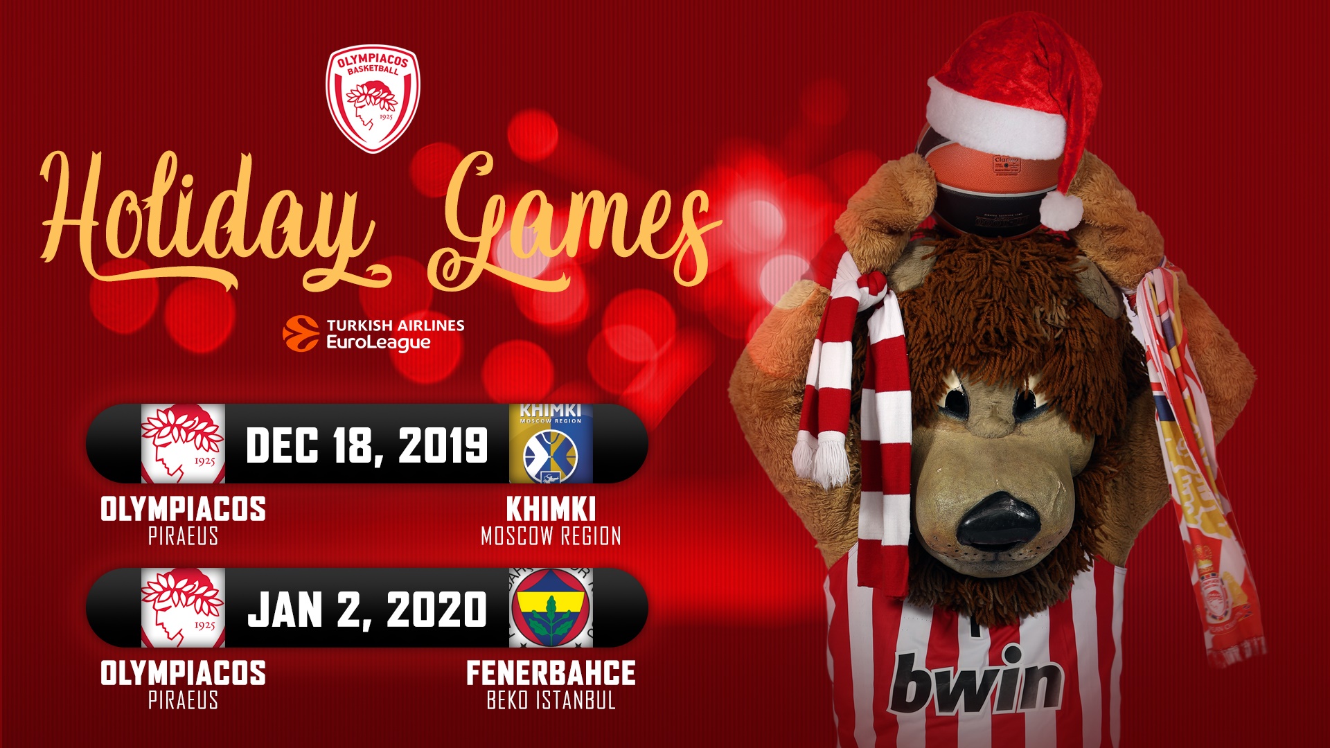 Τρίγωνα, κάλαντα, όμως, όχι μέσα την γειτονιά -όπως αναφέρει το γνωστό γιορτινό τραγούδι-, αλλά στο ΣΕΦ! Ελάτε στις αναμετρήσεις της ομάδας μας με την ΚΗΙΜΚΙMOSCOW REGION (18/12, 21.00) και την FENERBAHCEBEKO (02/01, 21.00) και συνδυάστε μαζί μας τη μαγεία των Χριστουγέννων, με την μπασκετική πανδα…