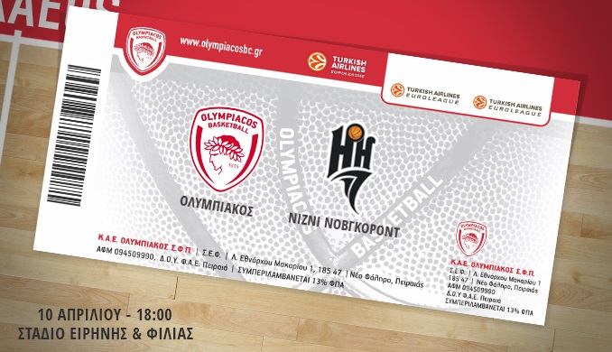Η Διεύθυνση Εισιτηρίων της Κ.Α.Ε. ΟΛΥΜΠΙΑΚΟΣ ανακοινώνει ότι η διάθεση των εισιτηρίων για τον αγώνα Euroleague, OLYMPIACOS – NIZHNY NOVGOROD, ο οποίος θα διεξαχθεί την Μεγάλη Παρασκευή 10/04/2015 με ώρα έναρξης 18:00 θα πραγματοποιηθεί ως εξής: