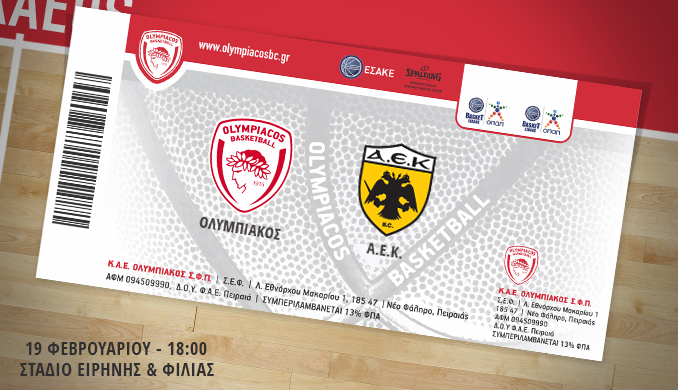 Η Διεύθυνση Εισιτηρίων της Κ.Α.Ε. ΟΛΥΜΠΙΑΚΟΣ ανακοινώνει ότι η διάθεση των εισιτηρίων για τον αγώνα Ελληνικού Πρωταθλήματος με την ΑΕΚ, ο οποίος θα διεξαχθεί την Πέμπτη 19/02/2015 με ώρα έναρξης 17:30 πραγματοποιείται ως εξής: