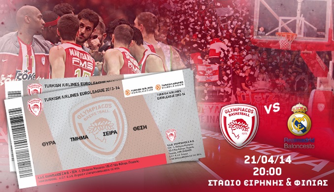 Η Διεύθυνση Εισιτηρίων της Κ.Α.Ε. ΟΛΥΜΠΙΑΚΟΣ ανακοινώνει ότι η διάθεση των εισιτηρίων για τον αγώνα των Playoffs της Euroleague, OLYMPIACOS BC – REAL MADRID, ο οποίος θα διεξαχθεί την Δευτέρα 21 Απριλίου 2014 με ώρα έναρξης 20.00 θα πραγματοποιηθεί ως εξής: