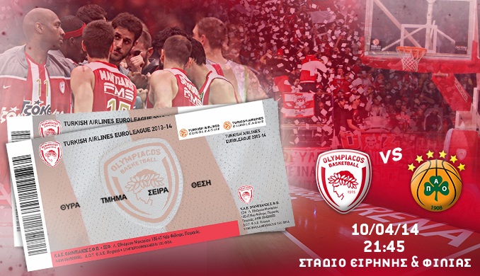 Η Διεύθυνση Εισιτηρίων της Κ.Α.Ε. ΟΛΥΜΠΙΑΚΟΣ ανακοινώνει ότι η διάθεση των εισιτηρίων για τον τελευταίο αγώνα του TOP-16 της Euroleague, ΟΛΥΜΠΙΑΚΟΣ – ΠΑΝΑΘΗΝΑΙΚΟΣ, ο οποίος θα διεξαχθεί την Πέμπτη 10 Απριλίου 2014 με ώρα έναρξης 21:45 θα πραγματοποιηθεί ως εξής: