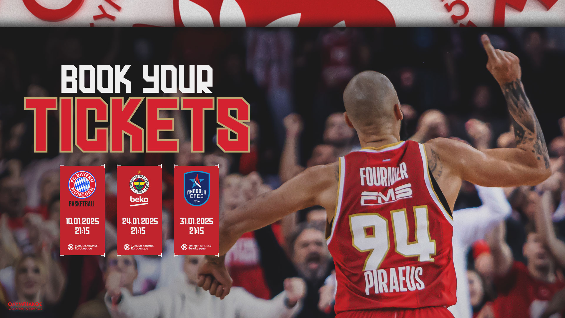 Για την καλύτερη εξυπηρέτηση και προγραμματισμό των φιλάθλων, η Κ.Α.Ε. ΟΛΥΜΠΙΑΚΟΣ ανακοινώνει ότι την Δευτέρα 23 Δεκεμβρίου και ώρα 14:00 θα ξεκινήσει η διάθεση εισιτηρίων για τους αγώνες Euroleague για τον μήνα Ιανουάριο.