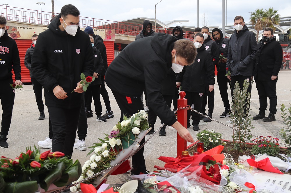 Το μεσημέρι της Τρίτης (08/02) σύσσωμη η ομάδα του Ολυμπιακού επισκέφθηκε το μνημείο των θυμάτων της Θύρας 7 και απέτισε φόρο τιμής στους 21 αδικοχαμένους φιλάθλους.