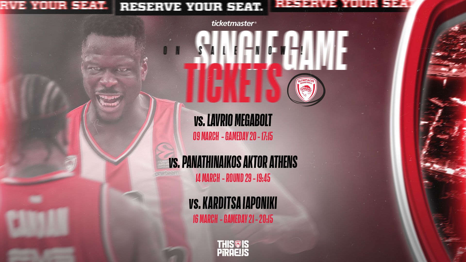 Τα εισιτήρια θα είναι διαθέσιμα προς πώληση σε πρώτη φάση, μέσω του www.olympiacosbc.gr από το www.ticketmaster.gr, είτε μέσω του τηλεφωνικού κέντρου, στο τηλέφωνο 2111996007 από την Παρασκευή 01/03/2024 και ώρα 12:00.