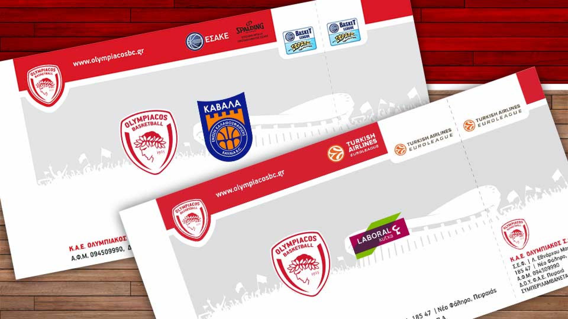 Η Διεύθυνση Εισιτηρίων της Κ.Α.Ε. ΟΛΥΜΠΙΑΚΟΣ ανακοινώνει ότι, η διάθεση των εισιτηρίων για τους αγώνες, ΟΛΥΜΠΙΑΚΟΣ - ΚΑΒΑΛΑ, (Δευτέρα 29/02/2016 με ώρα έναρξης 18:30) και OLYMPIACOS BC – LABORAL KUTXA VITORIA GASTEIZ (Παρασκευή 04/03/2016 με ώρα έναρξης 21:45) πραγματοποιείται ως εξής: