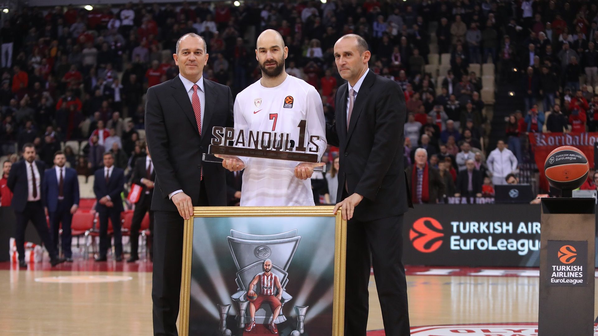 Πριν την έναρξη της αναμέτρησης με την Άλμπα Βερολίνου η ΚΑΕ Ολυμπιακός τίμησε τον Βασίλη Σπανούλη για το νέο του μεγάλο ρεκόρ, την ανάδειξή του σε πρώτο σκόρερ στην ιστορία της Ευρωλίγκας.