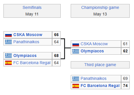 | 13/5/2012 | CSKA Moscow | 61–62 | Olympiacos | Sinan Erdem Dome |