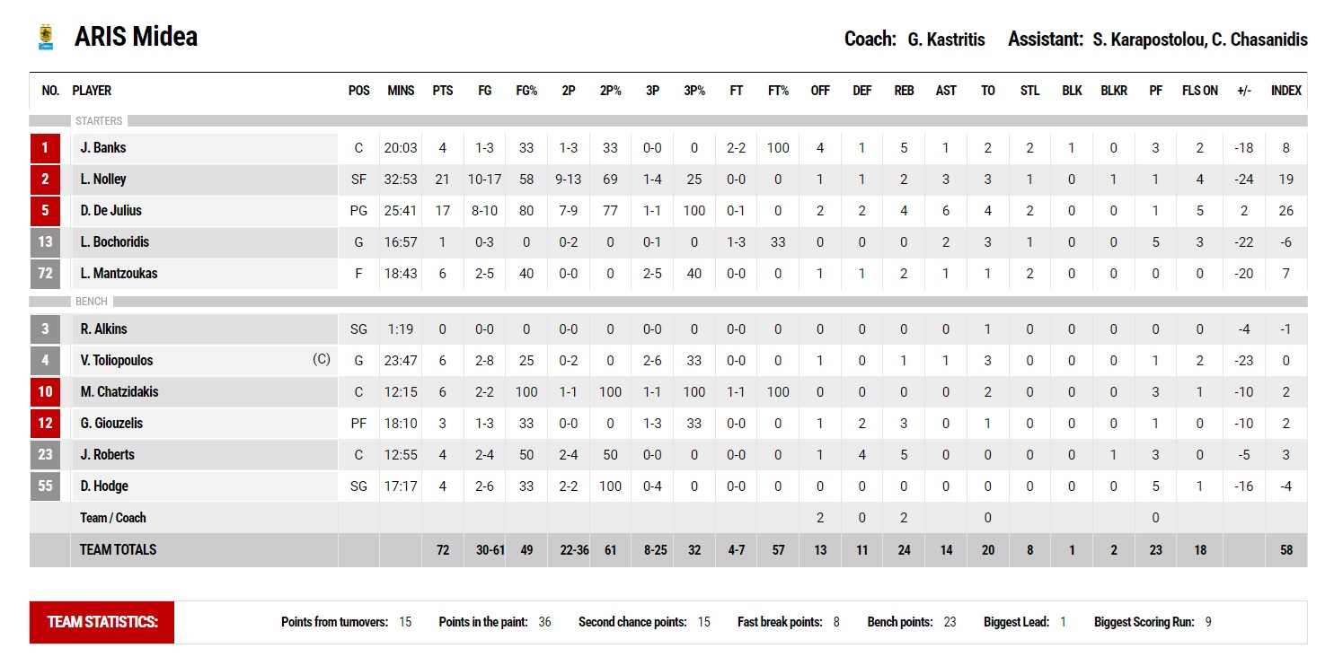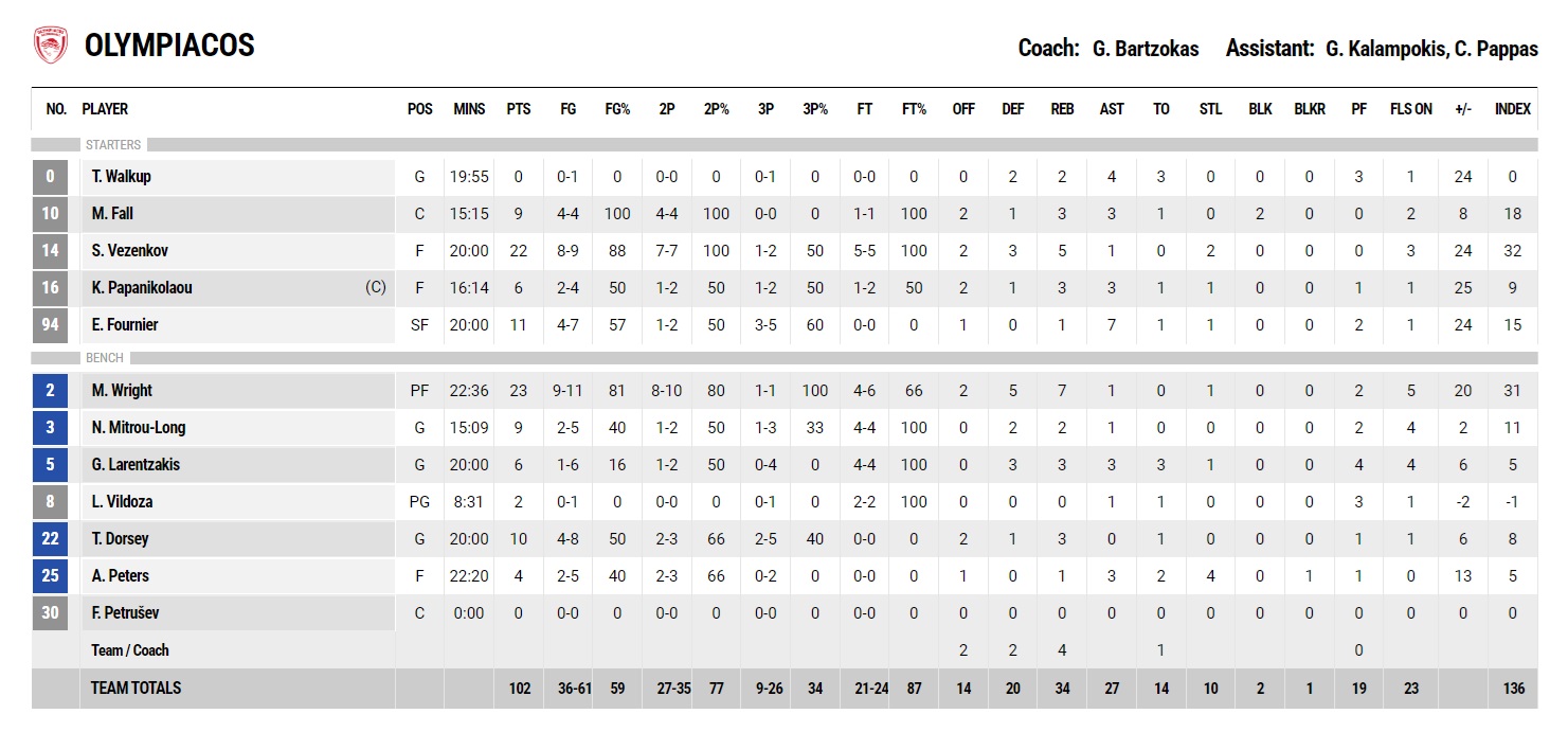 In the fourth quarter, the outlook remained the same, with Olympiacos controlling the game undisturbed. Moses Wright scored a three for the 98-67 at 35' (+31) and Mitrou-Long ran the fastbreak for the 100-67 (final score 102-72).