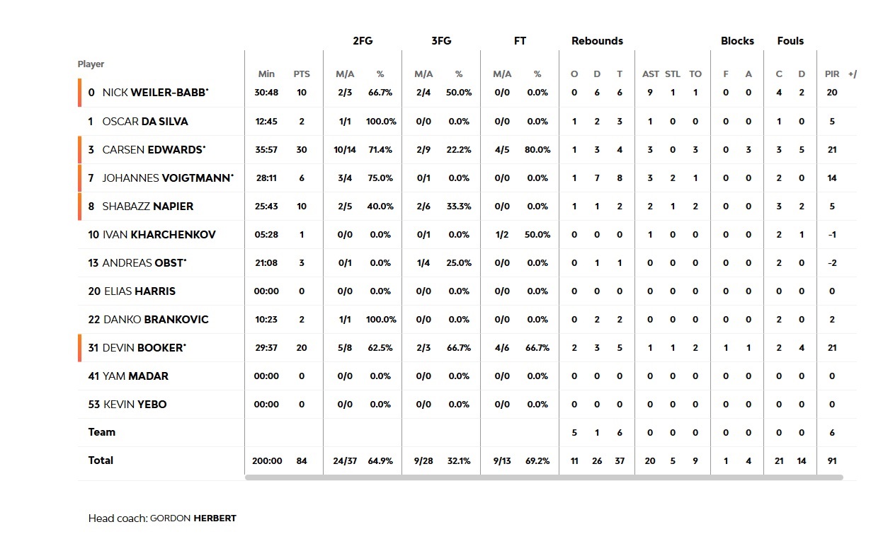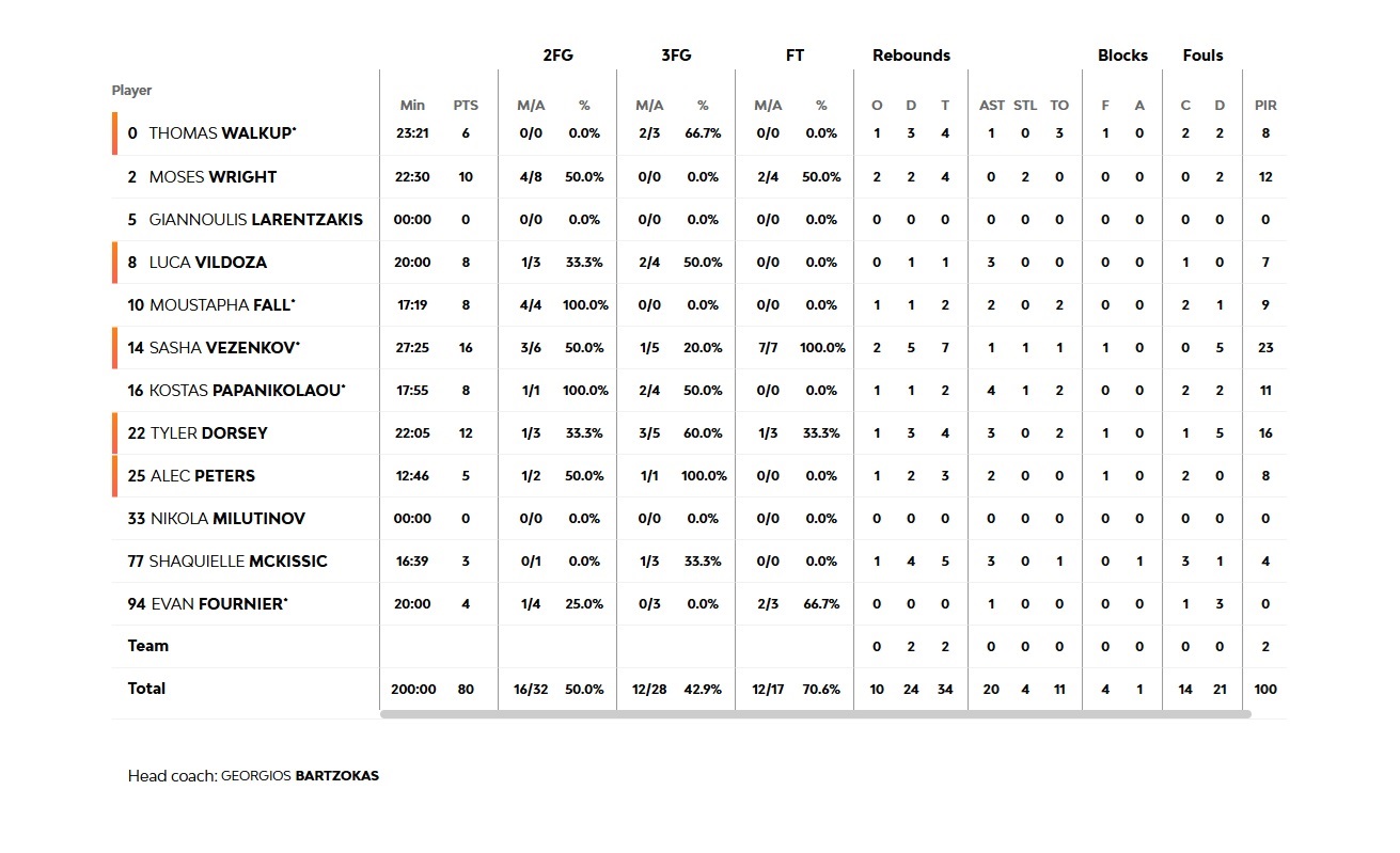 In the final quarter, Edwards and Booker continued hurting our team, but two back-to-back threes by Tyler Dorsey and Shaquielle McKissic offered solutions (66-71, 34'). However, inaction in defense and poor choices when attempting at scoring, allowed the hosts to score 9 unanswered points (75-71, 36') and the game became a derby. Two consecutive threes by Walkup and Dorsey gave our team a one-point game (79-78, 38'), but Napier scored a crucial three (82-78), when at the same time Sasha Veznkov was missing two attempts of his own at the end, with the game ending 84-80.