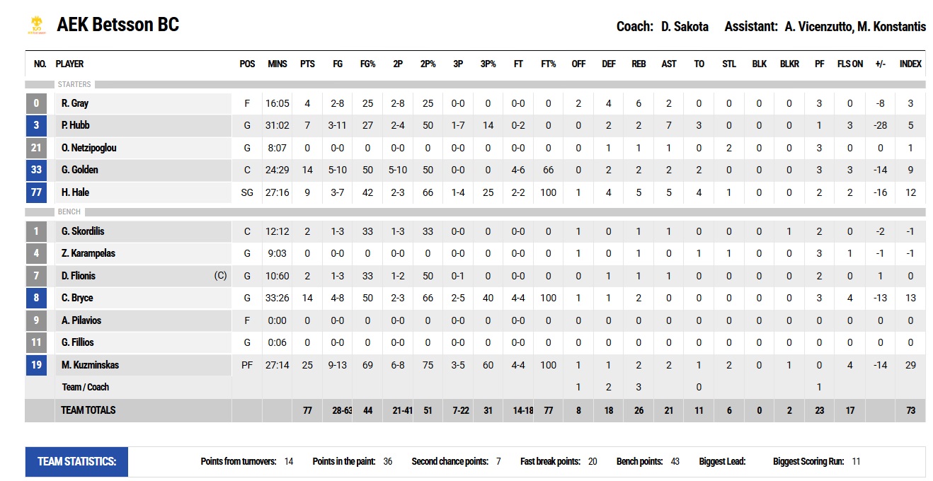 At the beginning of the third quarter, the home team successfully tied the score (45-45, 21'), but Olympiacos ran a 7-0 partial of their own and once again got to lead (45-52, 24'). Lack of intensity in defense allowed AEK to stay in the game, with the quarter ending at +8 (56-64). In the last quarter, the Piraeus team had clearer thinking when attacking the ball and greater defensive focus, hence dominating the game. They reached a +11 (58-69, 31') and then at +15 (62-77, 33'), with the 'yellow & balck' remaining competitive (74-83, 36'), however, without being able to actually threat the guests, who got to open up the difference (77-94, 38') mainly with Tyler Dorsey and Nikola Milutinov and got an important road win.