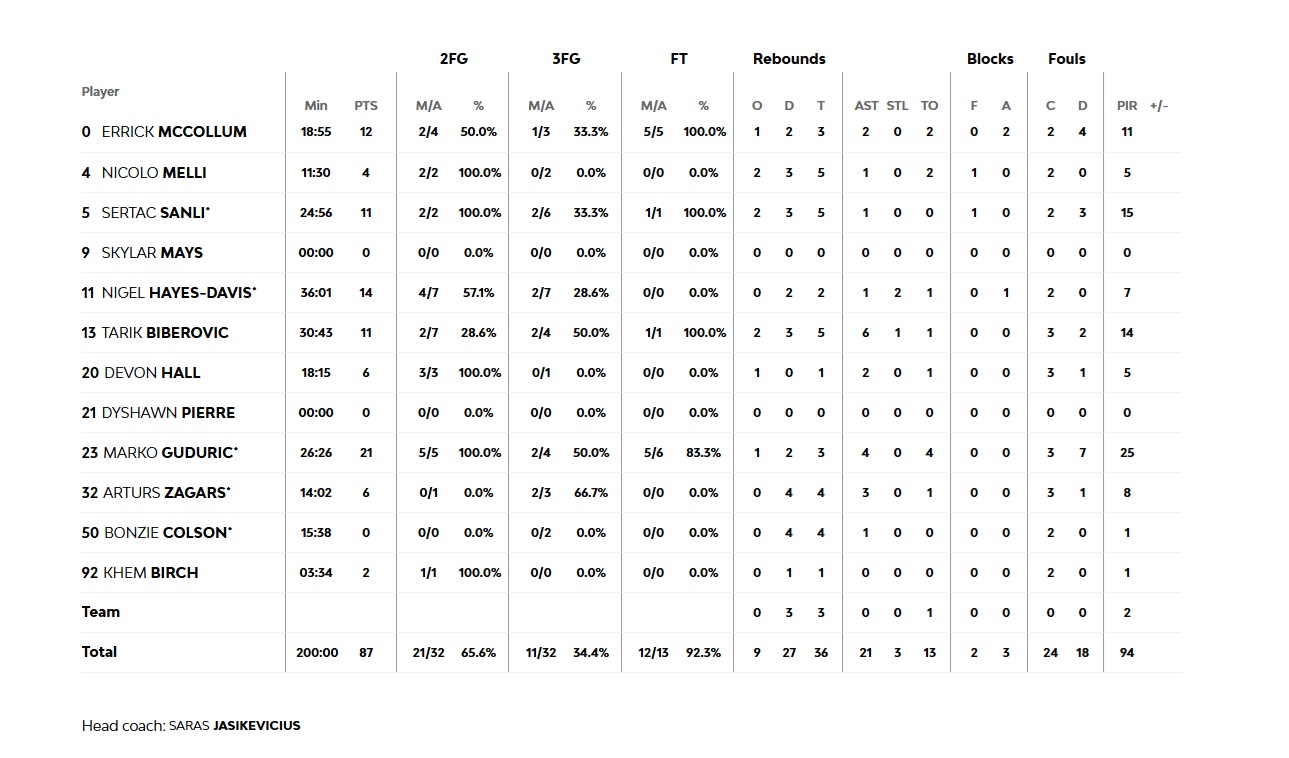 The quarters : 21-17, 40-43, 59-69, 77-87