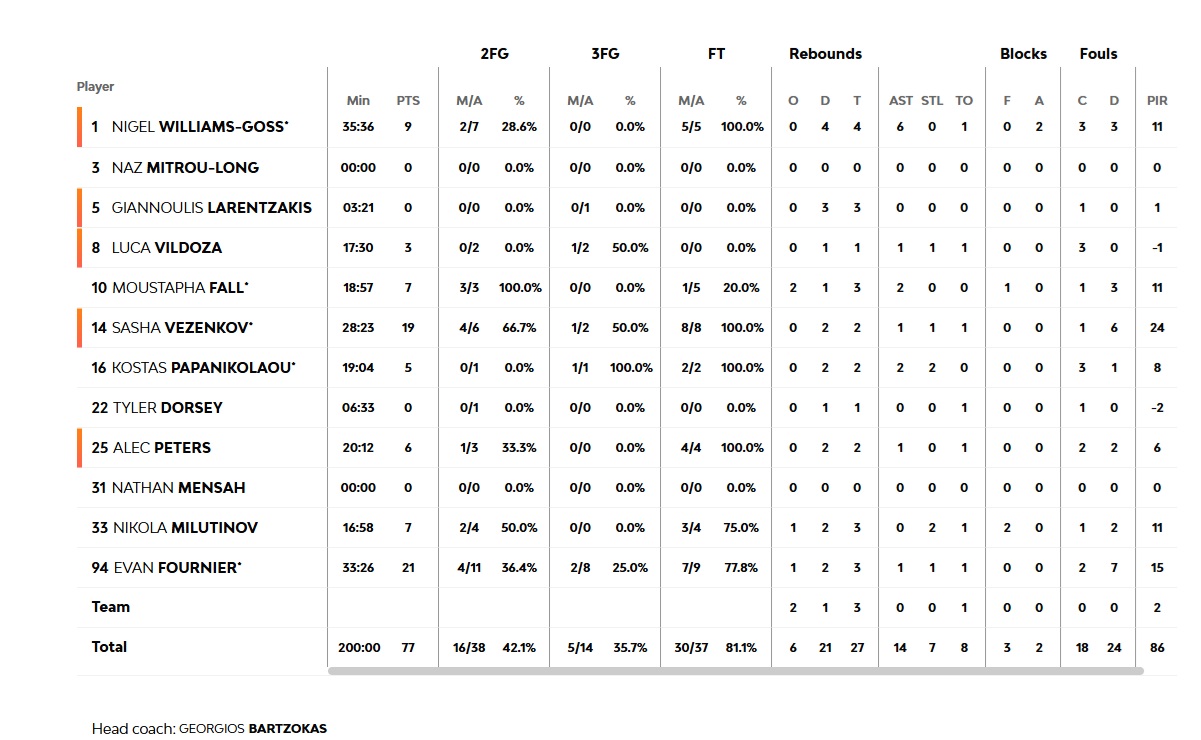 In the third quarter, five points by Kostas Papanikolaou (who received an honorary award by the Presidents on his record 350 Euroleague games played with the team) and two defensive plays of his, provided solutions for our team (48-52, 22'), that however, continued rather sluggish with its defensive efforts (48-57, 25'). Evan Fournier won a foul after scoring, while Nikola Milutinov scored in the post again, making the score 55-58. Fener, though, continued controlling the tempo, putting big pressure on the ball and moving the ball better in offense (55-62), with the third quarter ending at 59-69. In the last ten minutes, our team started out with more energy in the defensive end and clearer thinking when attacking, hence producing a partial 6-0 that made the score 64-69 (33'). Luca Vildoza scored a three (67-72), a 'breather' from the deep end for Olympiacos, with Fener however, building a new double-digit lead (67-78, 35'), following three off-target shots by our team. The guests were shooting with greater efficieny and consistency, taking advantage of our lackluster defense (69-83,37') and got the 77-87 win.