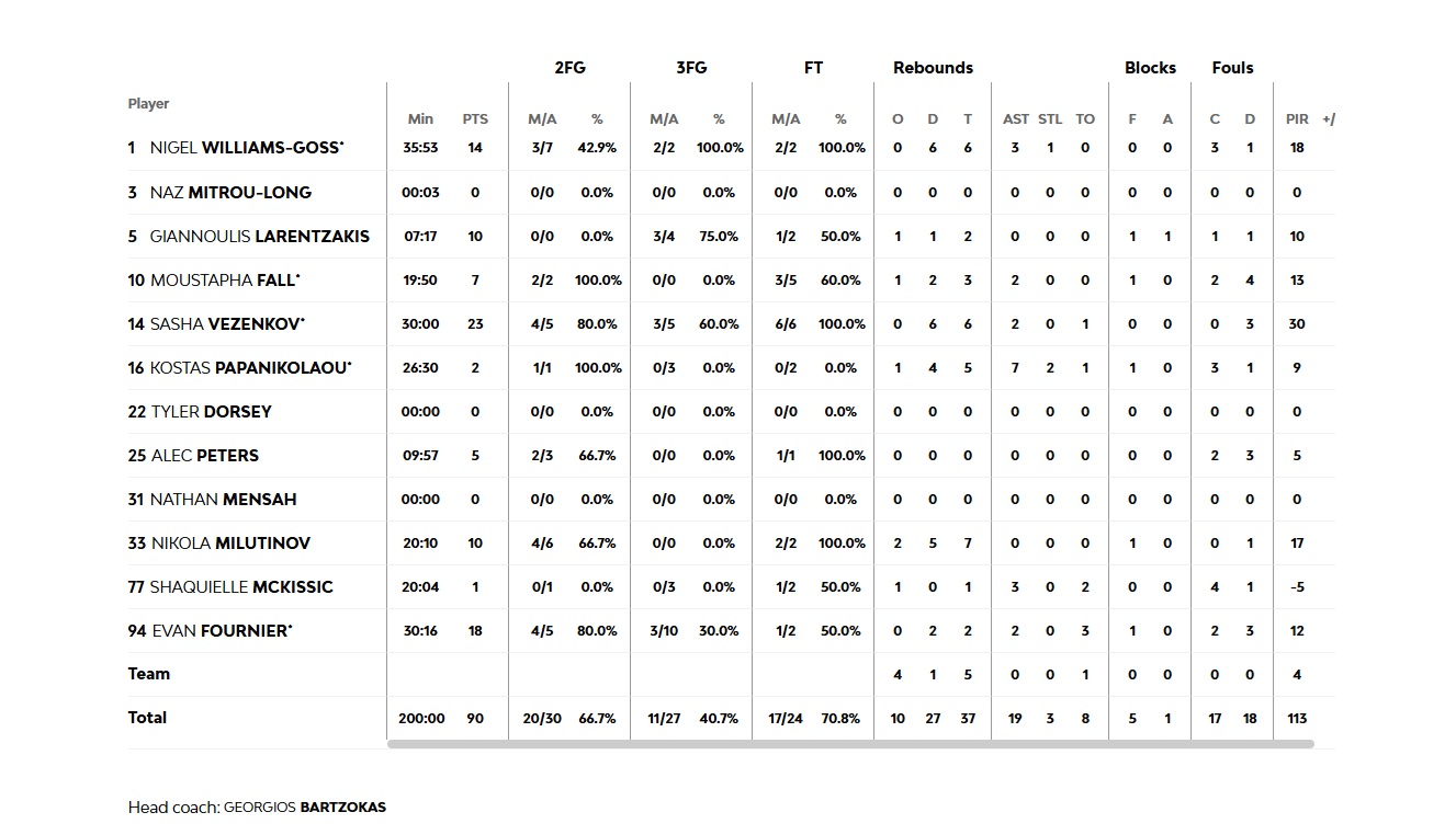 Intensity was not the same in the beginning of the second half and Olympiacos saw the difference dropping to single digits (40-49, 22'). However, our team found answers fast, with Wiliams-Goss, Evan Fournier and Sasha Vezenkov (44-59, 25') and Moustapha Fall dunked for the 46-61 a little later. The margin once again dramatically dropped (52-51), but the third quarter ended 58-67 for our team. The last 10 minutes began with Paris getting second chances (since they were winning the battle for the rebounds, making their final counter-attack (65-71, 33'), but our team held strong retaining the lead. A dunk by Milutinov, a big three by Williams-Goss plus 2 free throws gave Olympiacos a 15 point 'breather', who ran a partila 6-0 (70-88, 39') and finally got the 90-73 win, improving his winning record to 18-7.