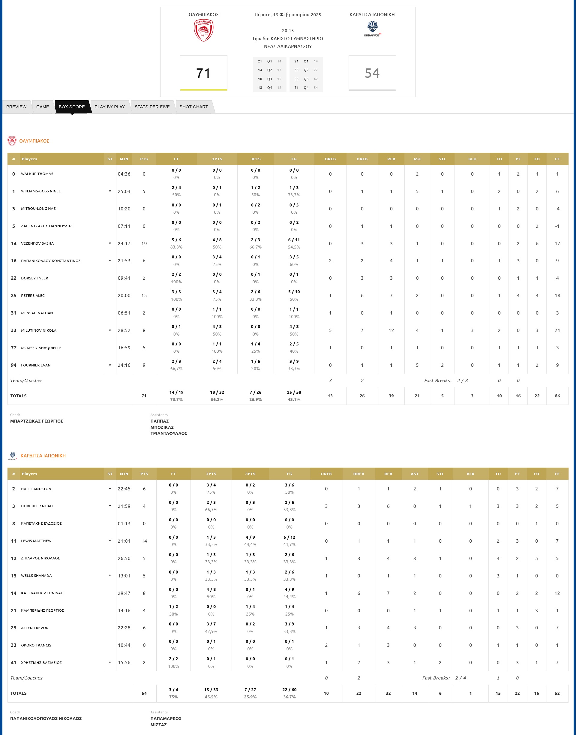 Olympiacos defeated Karditsa 71-54 at the Nea Alikarnassos gym and secured a spot in the Greek Cup Final 8 semifinals, where they will face PAOK (14/02, 20:15).