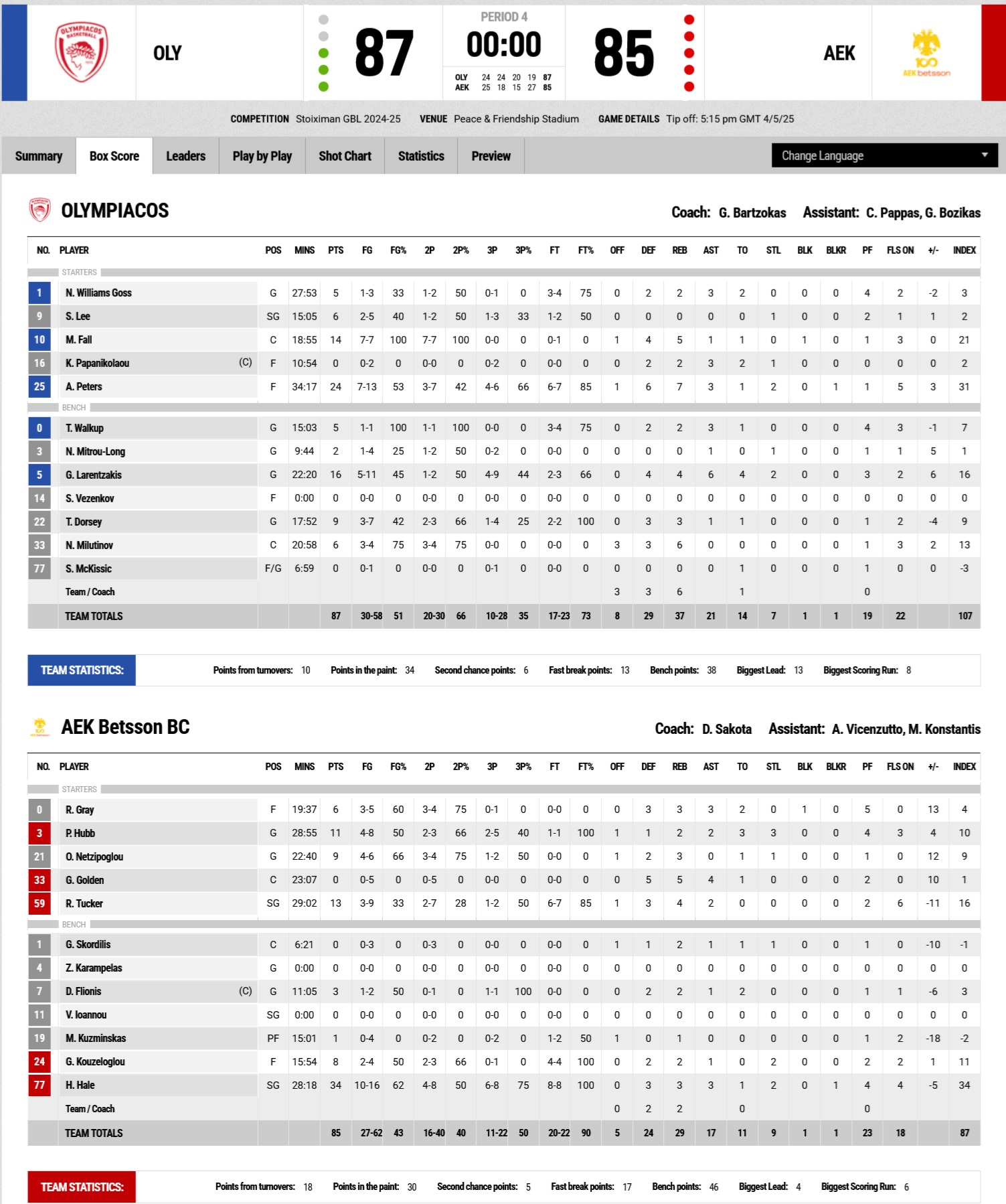 The final quarter began with a three-pointer from Alec Peters for a +13 advantage, but mistakes and rushed plays let AEK go on a 13-5 run, closing the gap to just one basket (76-64, 36'). A three-pointer by Larentzakis, a steal by the Greek international, and a fast-break finish by Naz Mitrou-Long extended the lead to 7 points (81-74). AEK remained competitive (81-79, 38') right until the end, bringing the game within two points (84-82) with 20 seconds remaining. Walkup then sank two free throws (86-82), Hale hit a contested three (86-85), but one more free throw by Walkup (87-85) sealed the win for Olympiacos after a final defensive stand.