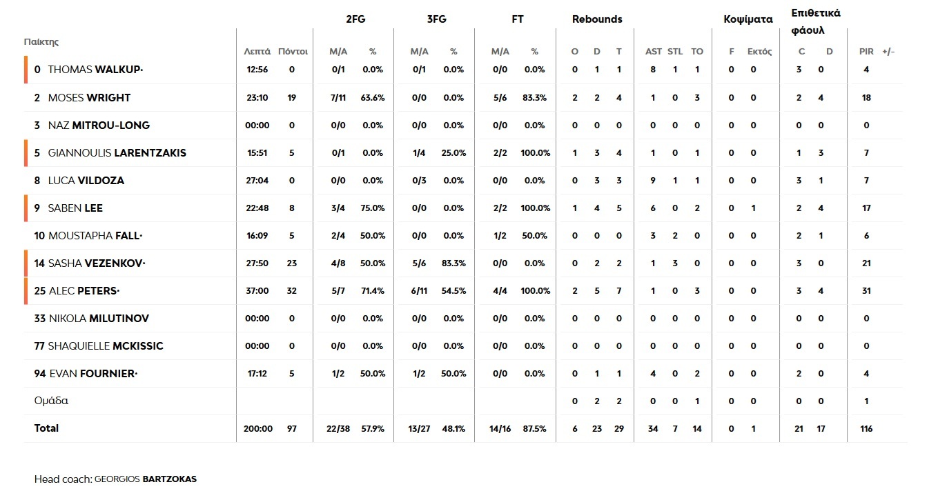 Our team continued to control the game, moving the ball patiently (81-69, 32'). Larentzakis hit from deep (89-74, 35'), as did Peters with a mid-range jumper (91-78, 37'). An unnecessary drop in focus in the final three minutes allowed a 6-15 run by Panathinaikos (97-93), but the game ended with a steal by Sasha Vezenkov on the final possession.