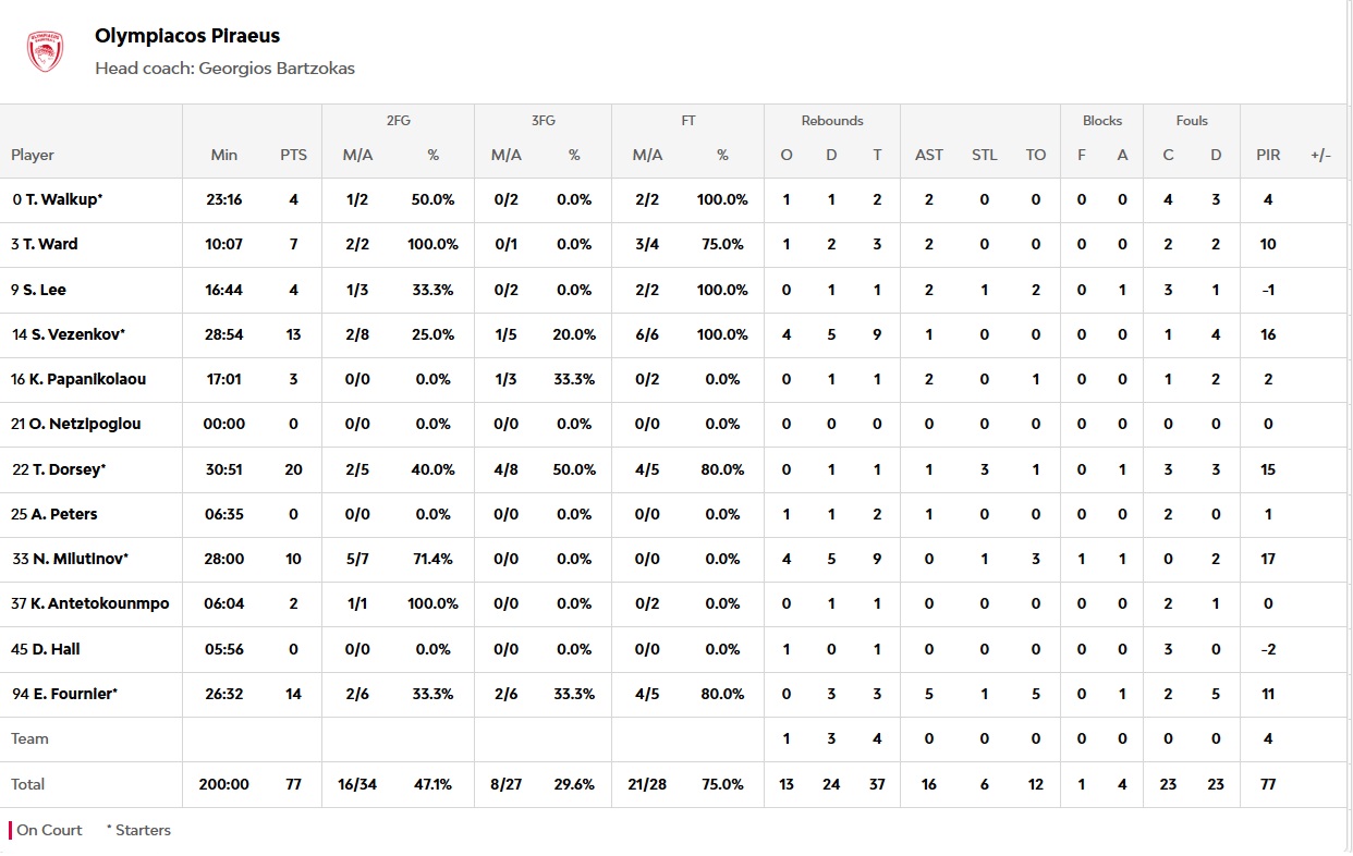The guests received a 10-0 run in the opening minutes of the final period, a result of poor decision-making on offense, missed three-point attempts, and turnovers (74-65, 35’). Evan Fournier was the one who sparked the offense again, and Thomas Walkup added free throws to close the gap to 74-73. However, the Piraeus team struggled with poor shooting, lacked patience in ball movement, and ultimately fell 89-77.