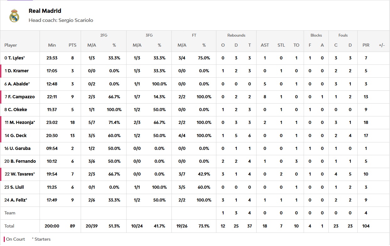 Due to the lack of patience on offense and the necessary intensity on defense by Olympiacos, Real Madrid managed to close the gap early in the second quarter (27-31, 12’), but Evan Fournier, with five consecutive points, pushed the lead back up to +9 (27-36). The hosts went on an 8-2 run and narrowed the margin again (44-45, 18’), capitalizing on our team's rushed offensive decisions and poor defensive reactions. However, every time Real Madrid found their rhythm, Olympiacos had a response. With Sasha Vezenkov leading the way, the first half ended with an 8-2 run and a 47-53 lead.