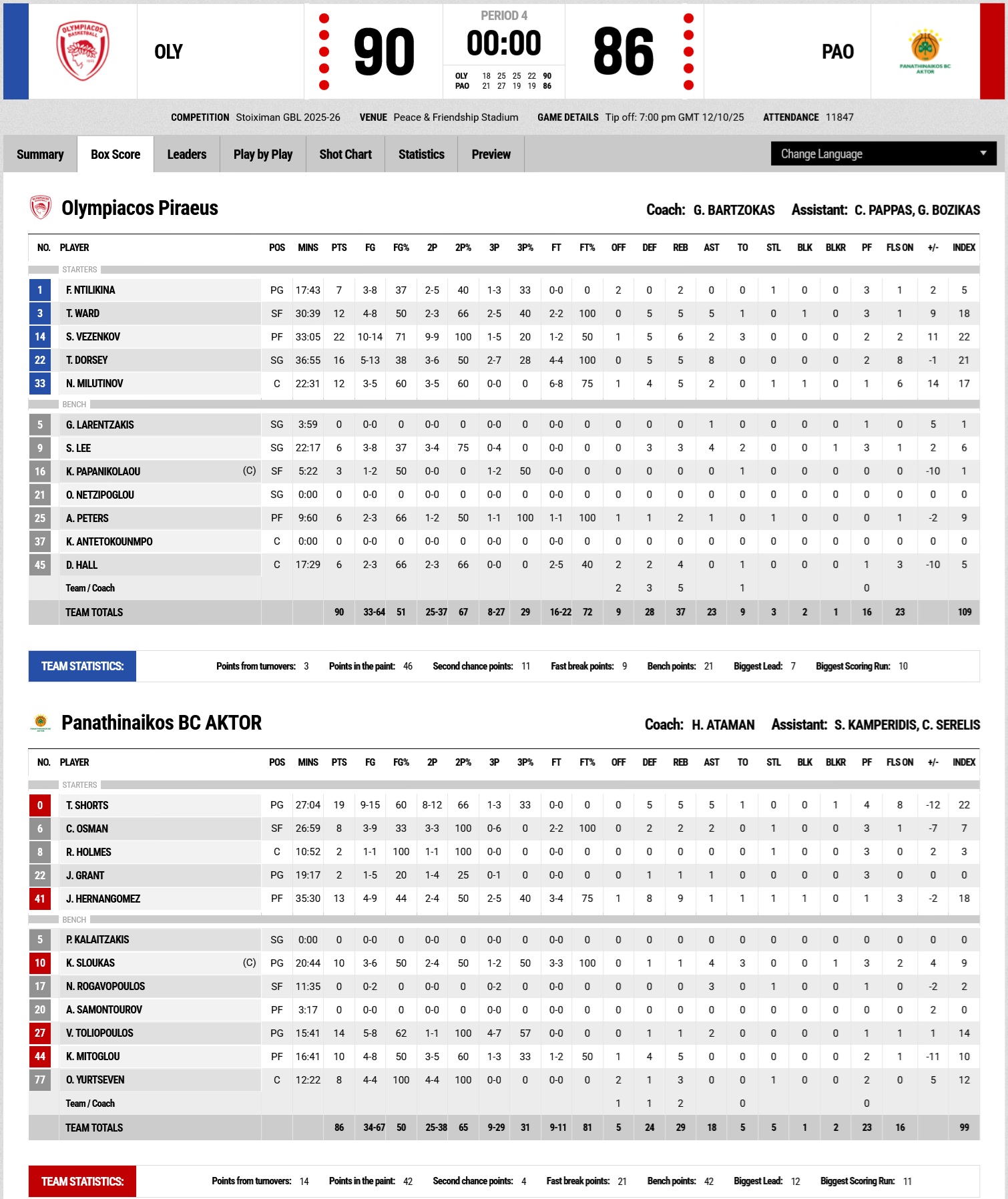 Two solid defensive efforts and back-to-back baskets by Tyler Dorsey gave Olympiacos a five-point cushion early in the final period (72 - 67). The international guard either scored or fed Donta Hall, who delivered two dunks for 76 - 70 (34'). Saben Lee provided solutions, and Vezenkov followed up with a crucial put-back to make it 82–81 with two minutes remaining. The Serbian center (Milutinov), fighting alone in the paint, made it 86 - 84, while Frank Ntilikina, with a personal play 28’’ before the end, gave the team a four-point lead (88-84). Tyler Dorsey remained calm at the free-throw line, the final defensive stand was successful, and Olympiacos claimed victory with a 90-86 win in the first derby of the season in the Basket League.