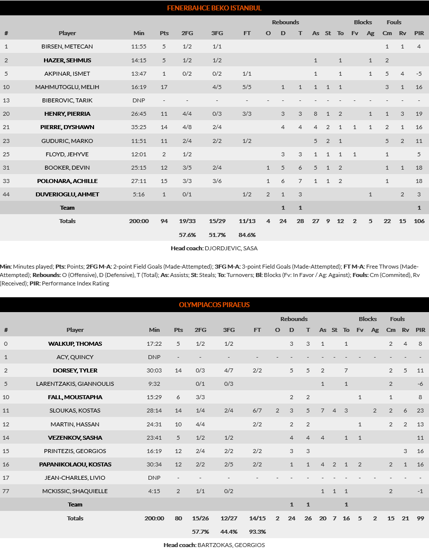 Olympiacos did not reach their usual standards and was defeated in Istanbul by Fenerbahce 80-94 for the 20th Euroleague round.