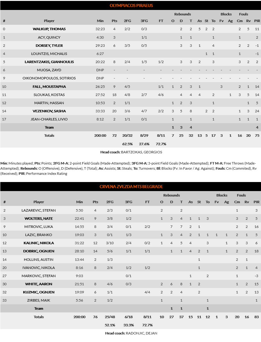 The game outlook did not change into the second half. Olympiacos got ahead with another shot and a foul (this time by Larentzakis, 39-37), however, the Serbian team, relying on their very physical defense, attacked back and went ahead 42-50 (at 25’). The ‘reds’ replied with a lot of pressure when defending and succeeded inching the game at 29’ (52-53).