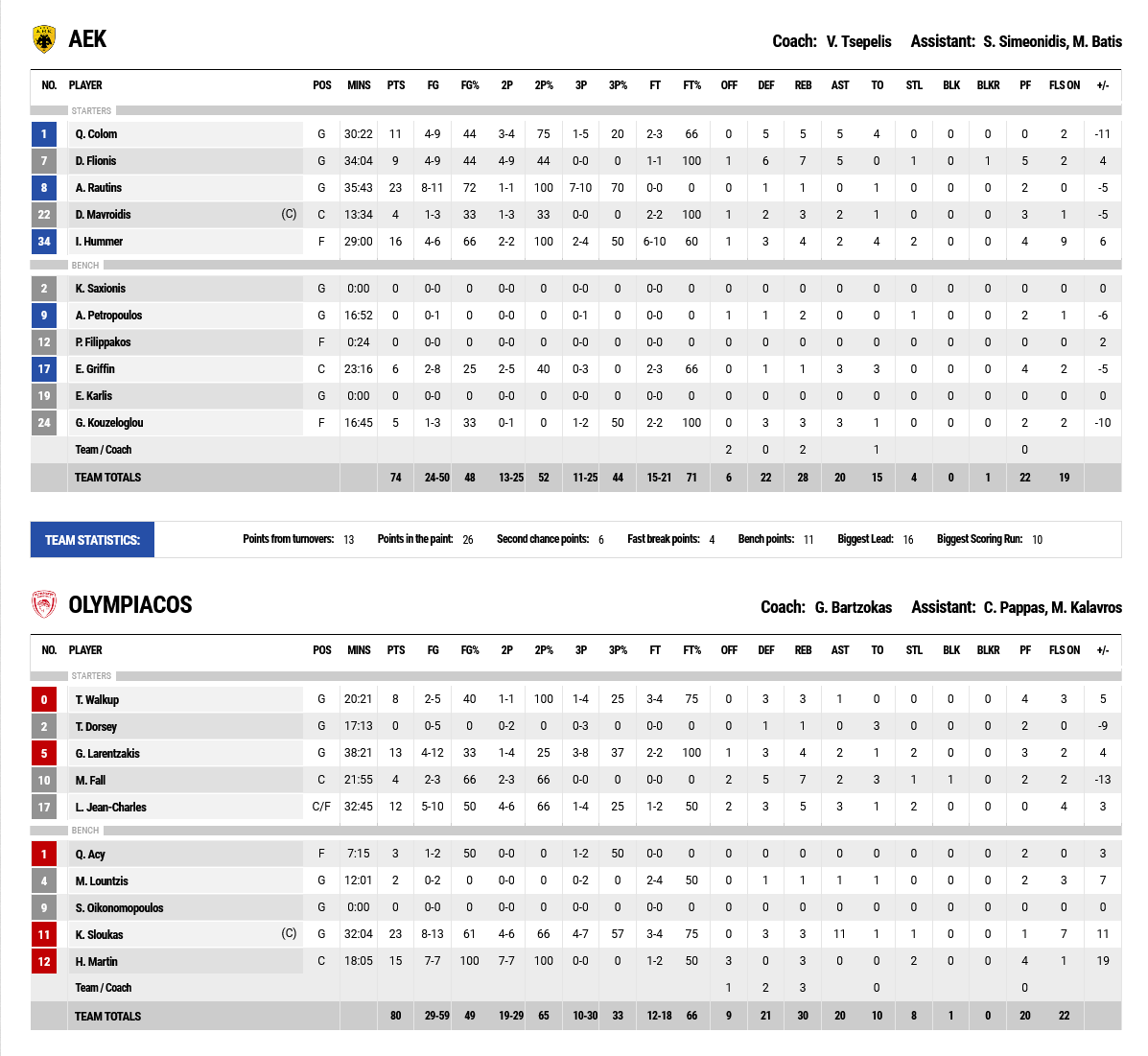 With a barrage of threes, AEK established a 16 point distance (55-39) at 27’. The ‘reds’ reacted, became more aggressive with their defense, showed patience when attacking and with Kostas Sloukas and Hassan Martin in the lead, they got ahead 61-58 at 33’. They did stop there though… With Sloukas executing impeccably behind the three point line, Olympiacos reached +8 (65-73) at 38’ and then leaning on solid defense, maintained the distance and got the win.
