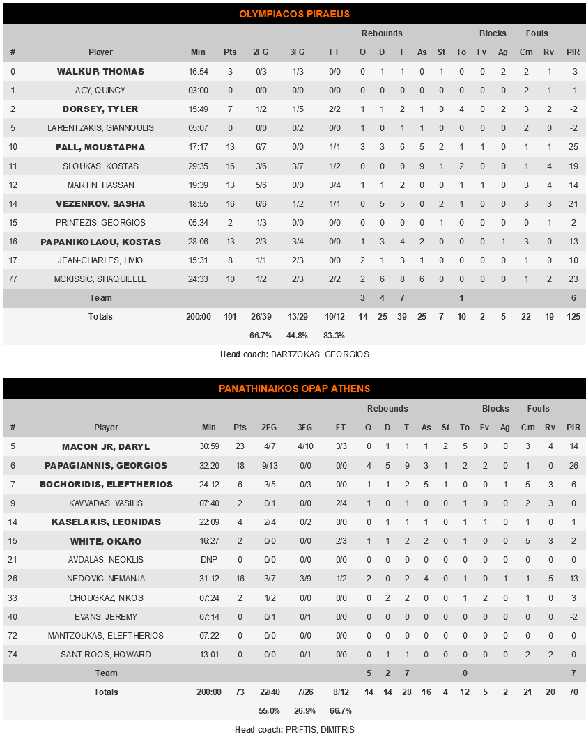 The ‘reds’ began the second half showing an inexcusable complacency with their defense, they did not move the ball efficiently in offense and paid the price… Panathinaikos opened fire from behind the three point line and dropped the difference to 14p. (60-46 at 25’). But that was as far as they went… Bartzokas’ players once again played a seminar worthy defense, at the same time when Vezenkov and Sloukas were seeing to increasing the difference margin to 30p. (83-53 at 32’). The remaining of the game had a purely procedural character, however, Bartzokas’ players refused to step on the breaks (97-62 at 36’). The 100 point barrier was ‘lifted’ with 2/2 free throws my McKissic (101-72 at 39’).